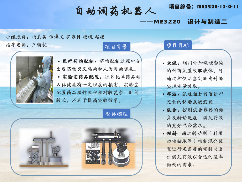 本项目考虑到两种调药场景(1)医疗药物配置:人工配置效率较低且更容易出现药物交叉感染和人为污染现象,在某些场景下还需长时间穿戴防护服对体力也是很大消耗。(2)化学药物配置:很多化学药品对人体安全健康有一定损害;人工配置还存在精确度不够高,流程复杂时间长,效率较低的问题。以此为导向,本项目计划设计并制作出可以高效精准完成自动化调药的装置,该装置将以精准配合,高效运行,功能完善为三大基本导向展开产品的设计与制造。