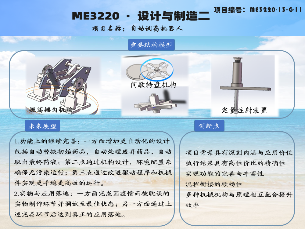 本项目名称为自动调药机器人,产品由三个模块组成,分别是药液供给模块,药液转移模块和振荡摇匀模块,三者分别负责盛放多种初始药液,通过其位置改变实现指定药液被抽取;定量提取初始药液并将药液转移至下一模块进行混匀操作;将不同的药液进行混合后进行充分的振荡摇匀。本产品通过多种机械结构与原理的组合以及驱动程序的设计,可以在确保达到高精度配合的前提下实现高效的自动调药过程。