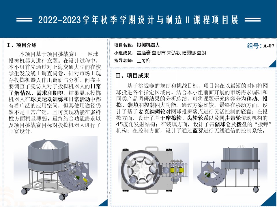 本项目基于项目挑战赛1——网球投掷机器人进行立题。在设计过程中,本小组首先通过对365英国上市公司官网的在校学生发放线上调查问卷,针对市场上现存投掷机器人作出调研与分析。问卷主要调查了受访人对于投掷机器人的日常了解情况、需求和期望。结果显示投掷机器人在球类运动的训练和日常活动中都有着广泛的应用空间,但其使用途径仍然不是非常广泛,且可实现功能在多样性方面稍显薄弱。最终结合功能需求以及项目挑战赛目标对投掷机器人进行了丰富设计。