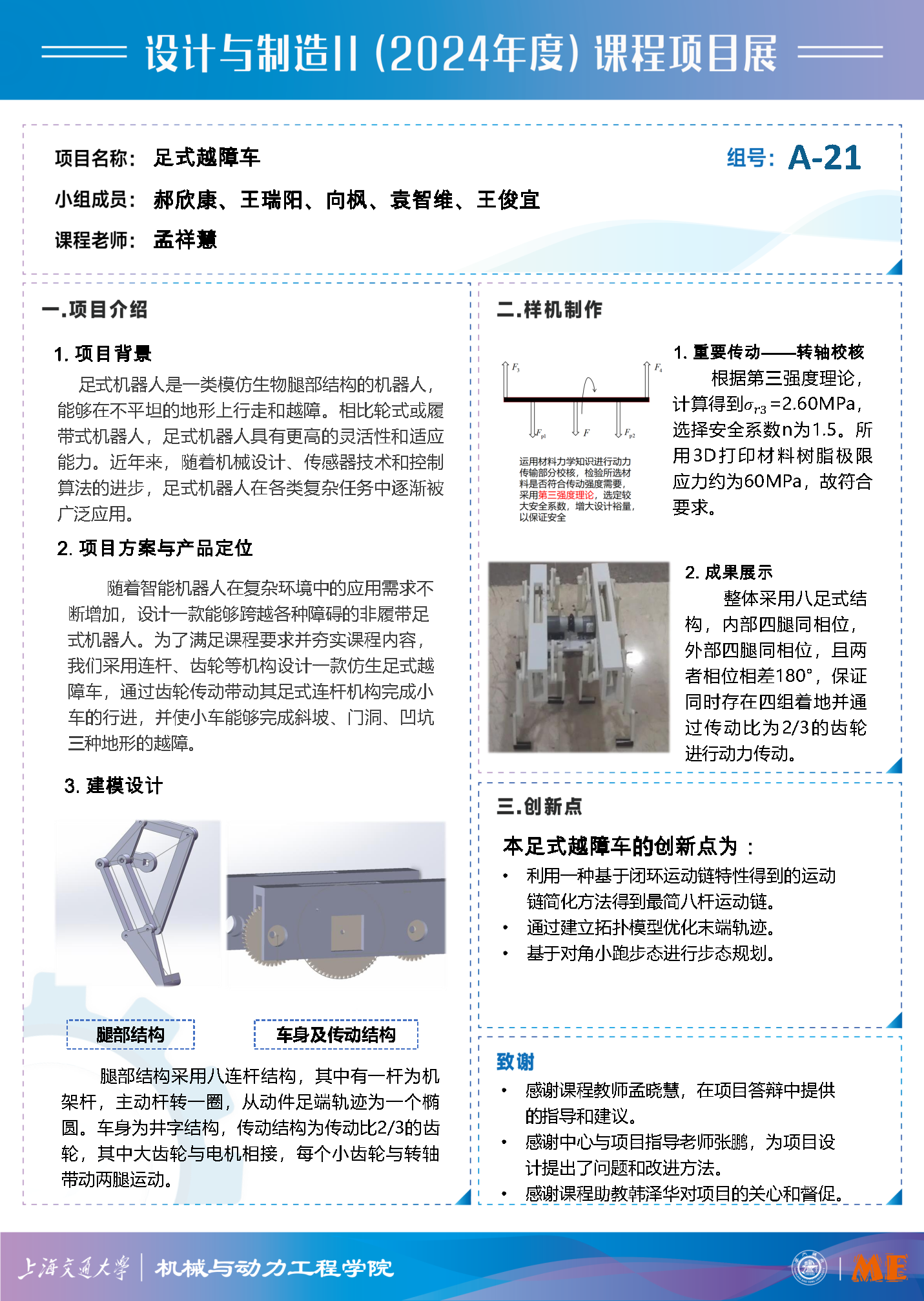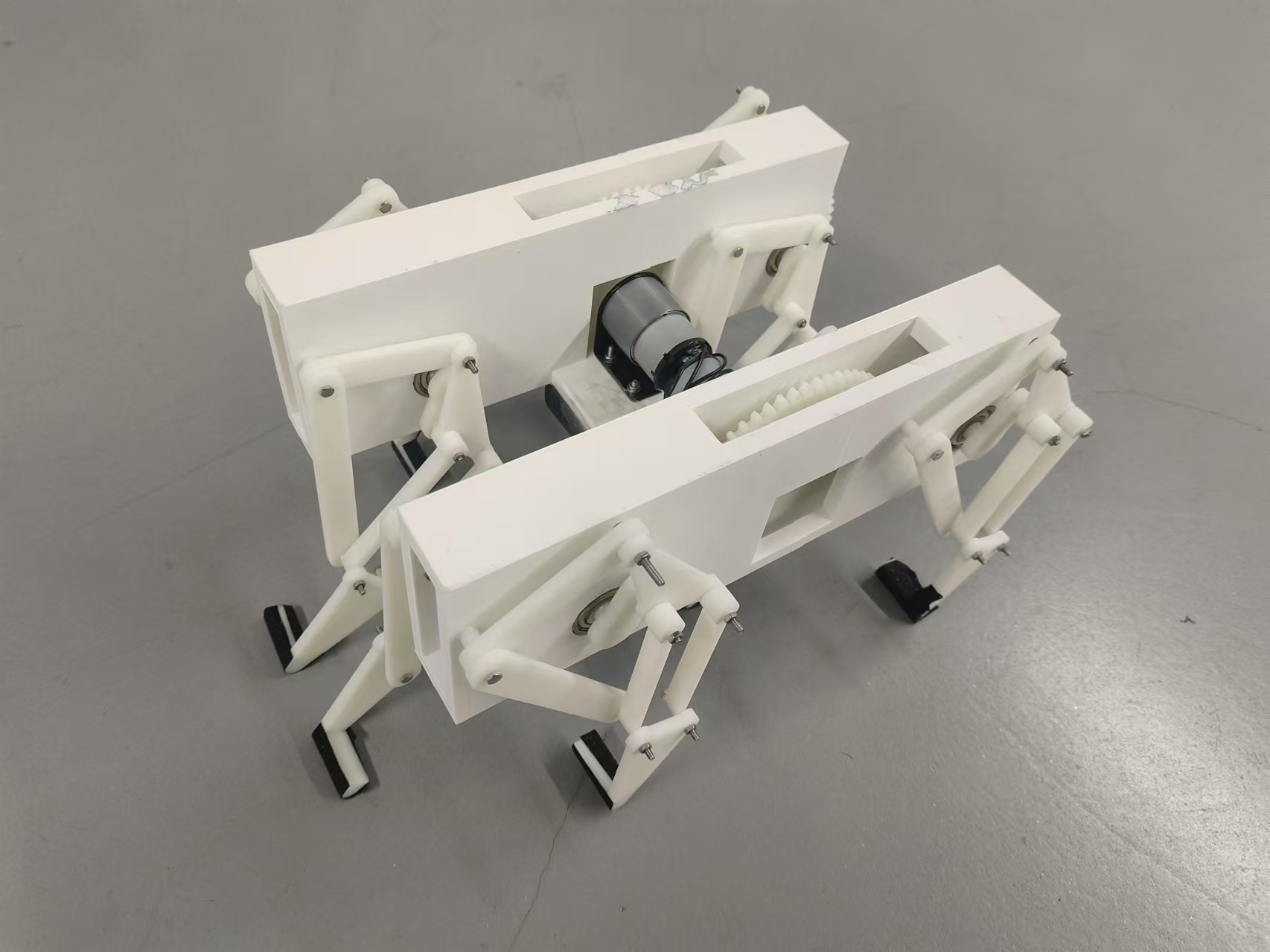 为了满足课程要求并夯实课程内容,我们采用连杆、齿轮等机构设计一款仿生足式越障车,通过齿轮传动带动其足式连杆机构完成小车的行进,并使小车能够完成斜坡、门洞、凹坑三种地形的越障。