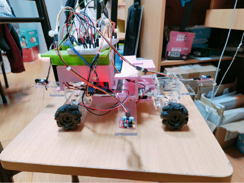 目前项目小车已完成了针对室内场景的智能避障,目标导航,物体抓取三大部分的功能。小车可以通过红外传感器对环境障碍进行实时检测,经过实体机的运行测试,确保了在任何新环境下小车都能成功完成智能避障这一目标。通过给定符合仓内参考系的目标点的坐标,小车可以在避障过程中逐渐向目标点逼近,最终成功避开障碍达到目标点,实现导航功能。在到达目标点位之后小车通过一个五自由度的机械臂可以实现对货物的抓取。