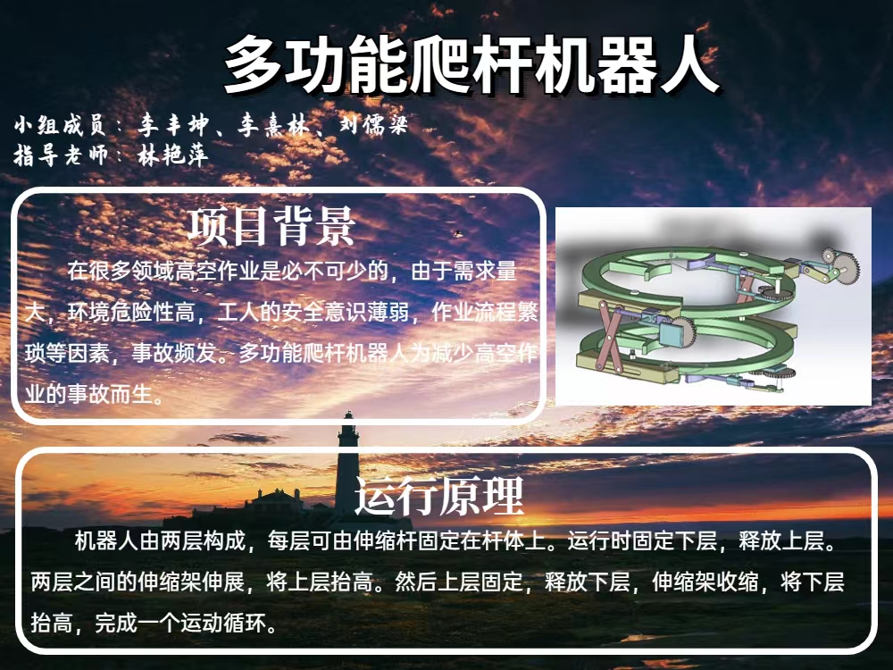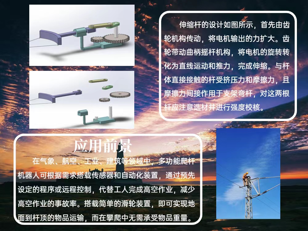 完成了装置的3D建模与运动仿真,在模型层面基本实现了项目目标。采用上下两层的主体部分交替抬升的方式实现整个装置的攀爬,即在下层伸缩架伸出挤压需攀爬的杆利用摩擦力将装置固定的情况下,中间伸缩架舒张,将上层抬升;在上层固定的情况下,下层伸缩杆回缩,中间伸缩架收缩,将下层拉升。同时由于直线上升的方式,保证了稳定性,仅需要循环指令的控制系统也十分便于操作,同时由于对称的设计,应力分布较为均匀,降低了材料的要求,从而降低了成本。