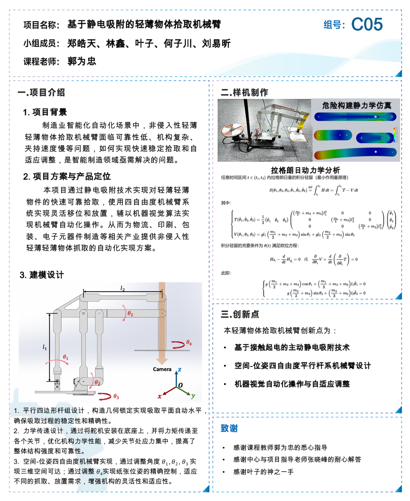 本项目通过静电吸附技术实现对轻薄轻薄 物件的快速可靠拾取,使用四自由度机械臂系 统实现灵活移位和放置,辅以机器视觉算法实 现机械臂自动化操作。从而为物流、印刷、包 装、电子元器件制造等相关产业提供非侵入性 轻薄轻薄物体抓取的自动化实现方案。