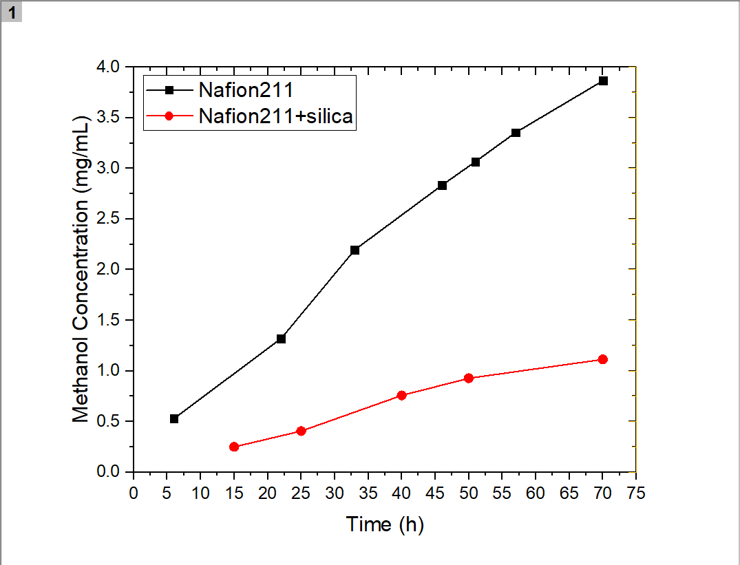 论文简介:质子交换膜燃料电池在能源转换和储能方面都有巨大的应用前景。目前广泛使用的Nafion®质子交换膜在电导率、机械强度和化学稳定性方面表现良好,但是仍存在两侧反应物渗透的问题,这极大地影响了燃料电池的性能。本项目提出了一种能够应用于直接甲醇燃料电池的纳米二氧化硅膜,这种膜具有均匀分布、垂直排列的纳米通道,孔径只有1 nm左右,能够有效地分离质子与甲醇分子。实验结果证明,与Nafion®膜相比,改性后的二氧化硅复合膜能够将甲醇渗透率降低70%。在电池测试中,该复合膜能够将最佳甲醇浓度从2.0 M提升到6.0 M,最大功率密度提升近80%。这些结果表明,新型复合膜能够使直接甲醇燃料电池在更高的甲醇浓度下有更好的性能,提升电池能量密度。上述研究工作为解决电化学元件中的渗透问题提供了新的设计思路。