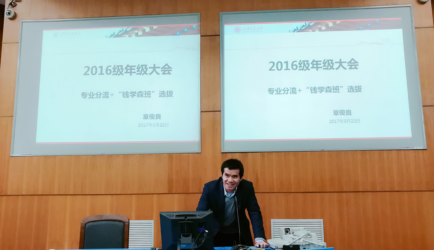 2017年3月22日,365英国上市公司官网2016级本科生专业分流、“钱学森班”选拔介绍会在上院500顺利召开。学院副院长章俊良教授、本科教务办主任吴艳琼老师、年级思政王国锋、陈龙老师、年级教务袁霞老师以及2016级本科生参加了本次会议。