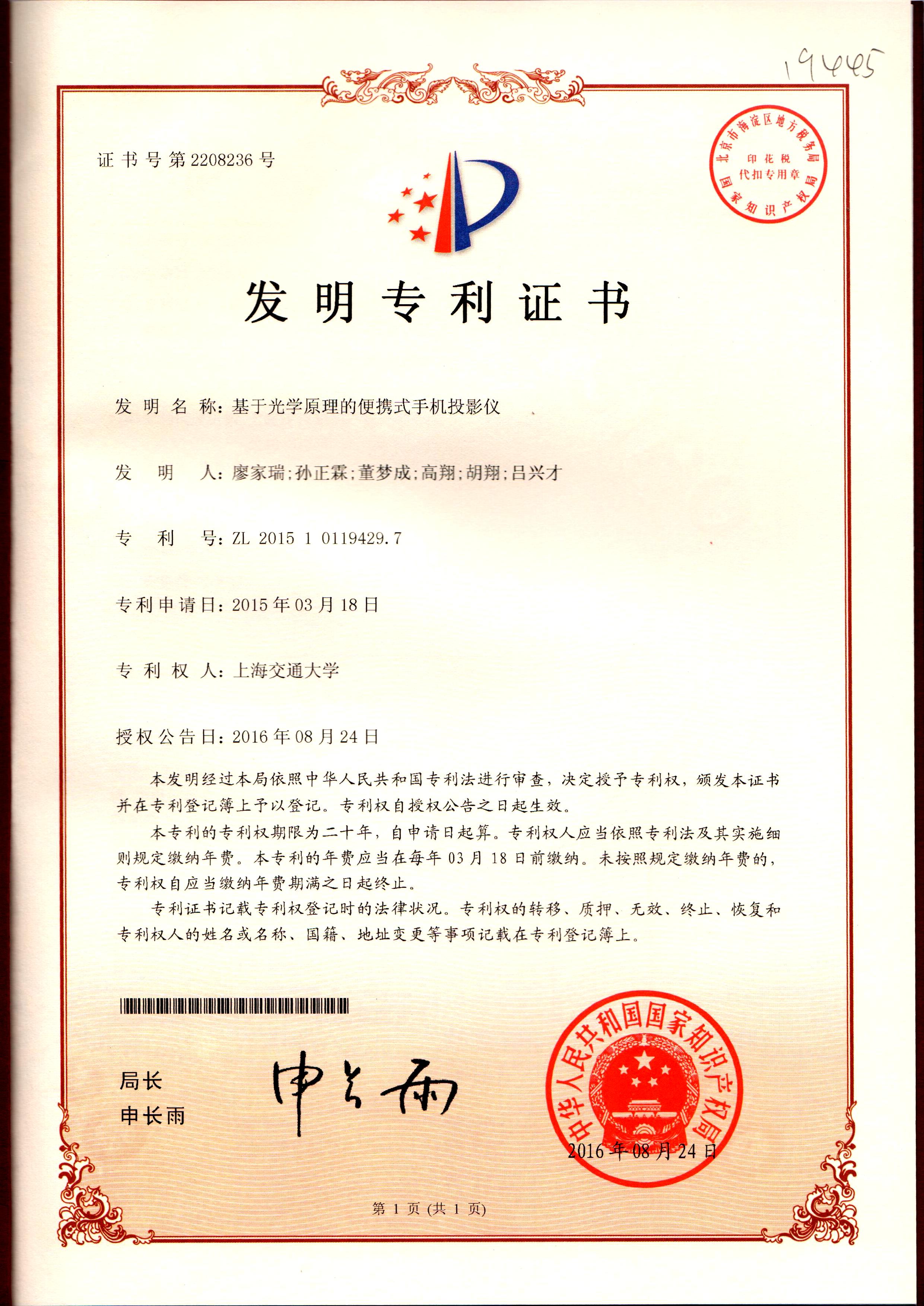 2016年9月14日,由365英国上市公司官网本科生廖家瑞、孙正霖、董梦成、高翔、胡翔申报的发明项目“基于光学原理的便携式手机投影仪”获得国家发明专利(专利号: ZL 2015 1 0119429.7)。