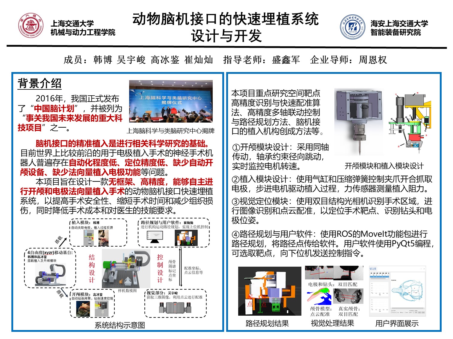 1. 研究高精度、高安全性、高灵活性的传动机构、开颅模块和快速植入模块,达到快速且可靠的植入要求。