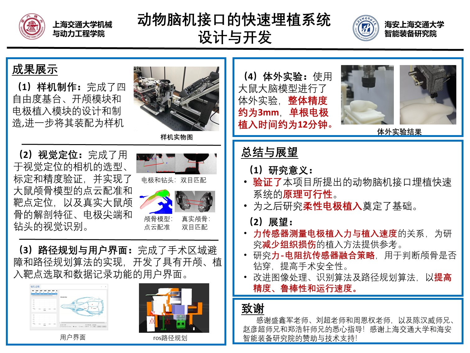 1. 完成了四自由度基台、开颅模块和电极植入模块的设计和制造,在大鼠颅骨模型上开展了开颅和植入实验。