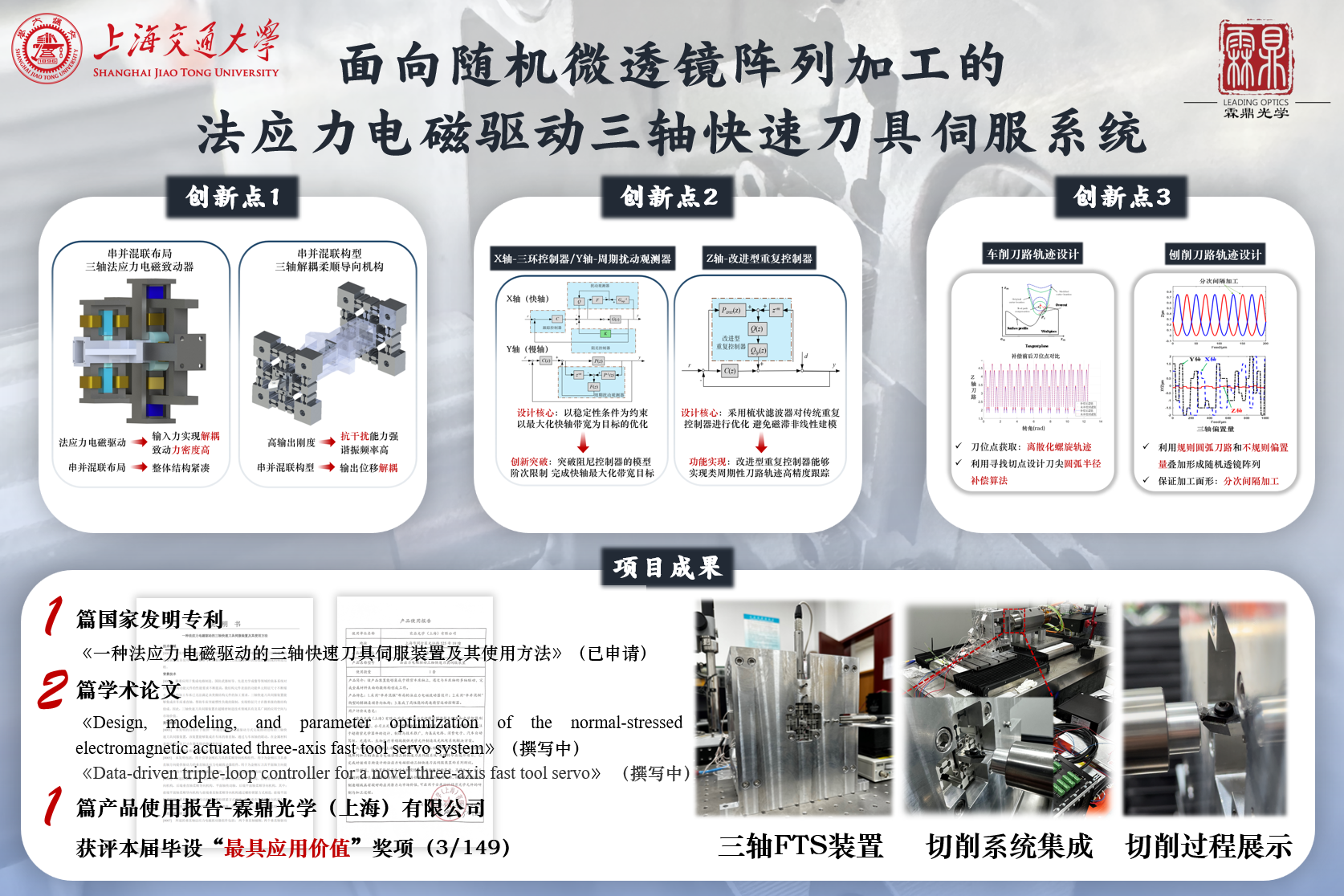 本项目提出了一套具有创新性设计概念的法应力电磁驱动三轴FTS系统,实现了系统高频响、低耦合、强抗扰的设计目标;利用所提出的高速精密运动控制器控制装置各轴与车床联动,依照所提出的车削、刨削优化刀路轨迹实现了随机微透镜阵列模具的高效、高精加工。项目目前已申请一项国家发明专利,并有两篇学术论文撰写中;项目成功通过霖鼎光学(上海)有限公司的企业验收测试,在超精密制造领域具有广阔的应用前景与极佳的市场价值。