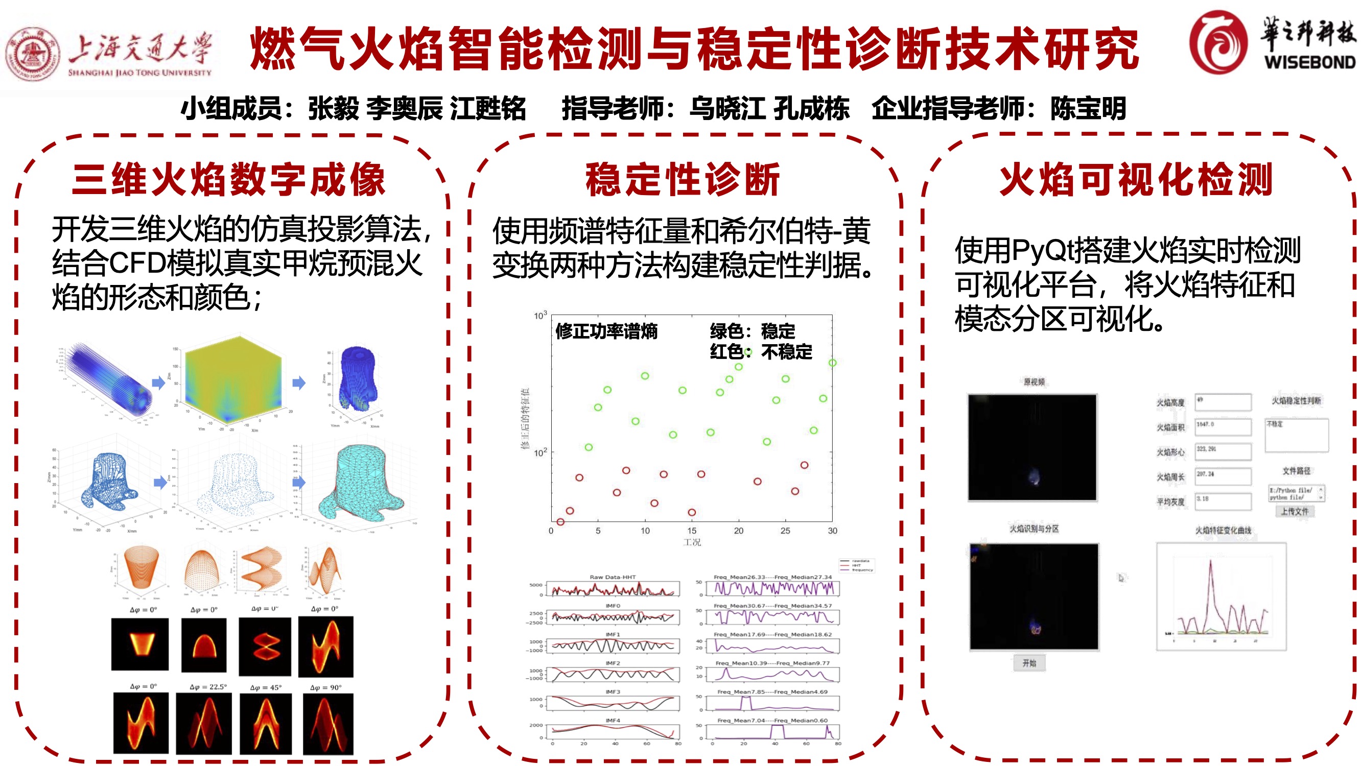 完成燃烧与光学诊断实验平台搭建与测试;通过不稳定激励源诱导燃烧不稳定捕捉不同外扰条件下火焰传播与发展规律,分析典型的燃烧不稳定现象,针对现有机制在解释燃烧稳定性方面的不足提出改进方法;构建针对三维火焰的光学虚拟相机模型,通过改变虚拟相机的焦距、光圈、景深等参数,获得外部光源干扰条件下不同空间分辨率、相机观察视角的三维火焰投影图像;针对不同燃烧状态提取特征并进行量化分析,实现燃烧模态分类与分区,输出火焰不同燃烧模式分区、特征参数分布;对火焰图像/光谱特征的数据结构、深度学习框架和参数等进行全方位优化,改进识别算法,实现复杂燃烧特征的快速可视化。