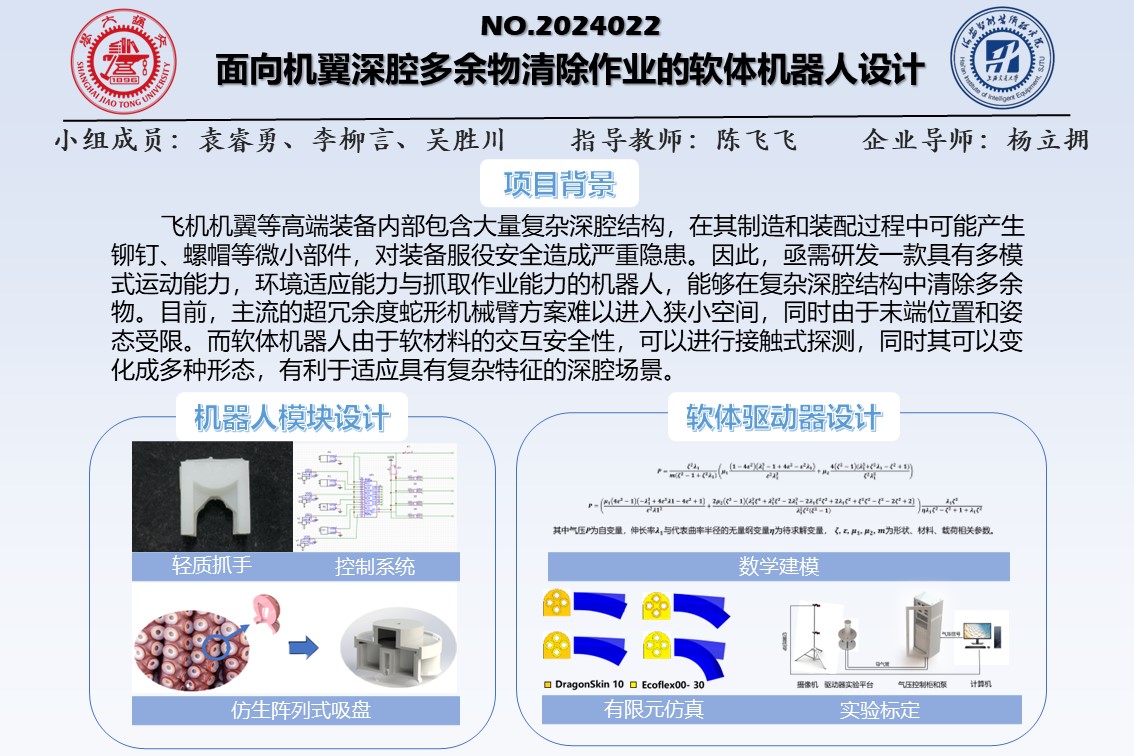 飞机机翼等高端装备内部包含大量复杂深腔结构,其制造和装配过程中可能产生的铆钉、螺帽等微小多余物将造成严重安全隐患。为此,亟待研发可用的深腔作业机器人,执行多场景环境约束下的清除任务。新兴的仿生软体机器人以其交互安全性和运动灵活性,有望解决该挑战。本项目围绕软体机器人的运动、抓取与控制,基于仿真和实验,设计软体驱动器、软体抓手与吸附单元,并开发气动控制系统进行协同控制,最终完成软体机器人的功能验证。