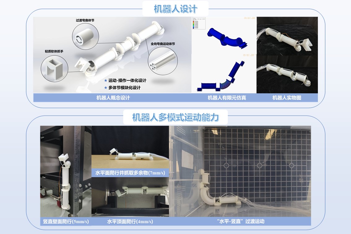 本项目对软体驱动器材料、形状、长度等设计参数提出了优化,创新了仿生阵列式吸盘,设计了一款软体机器人。该软体机器人展现出多模式运动能力,可以进行场景过渡,与软体抓手配合后,能够对非规则多余物进行抓取。本项目设计了相应的气路和电路,集成了气动控制系统,实现了对软体机器人的协同控制。经实验验证,该软体机器人成功执行了运动和抓取的任务。