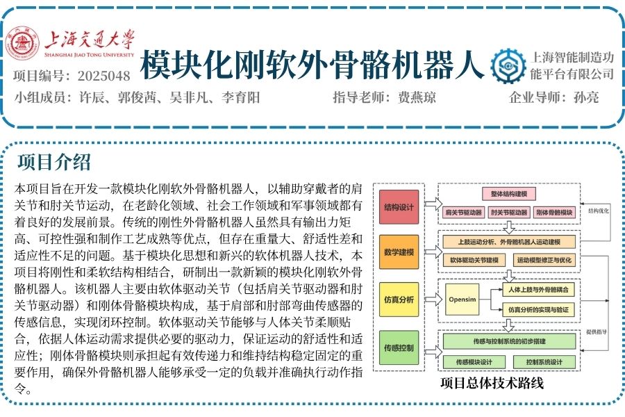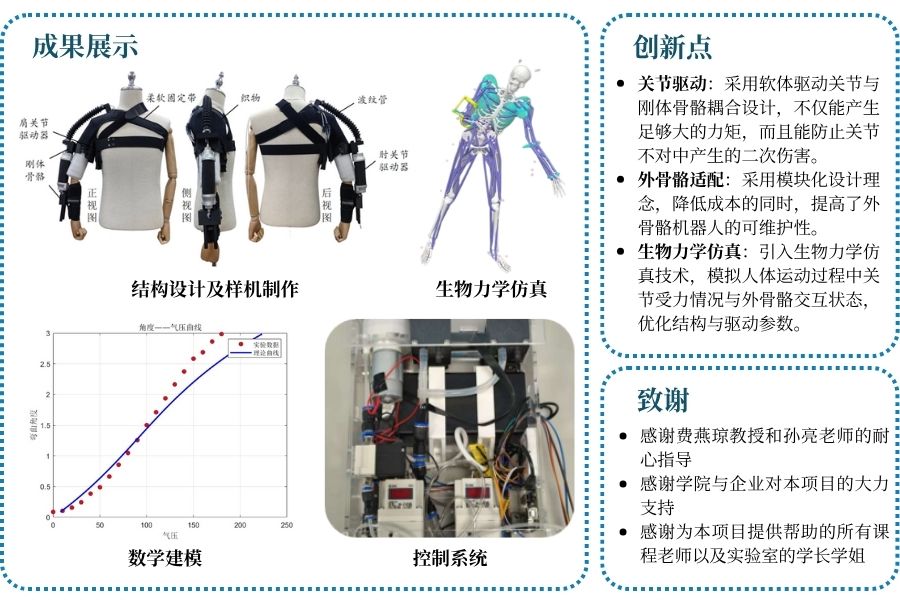 制作肩、肘关节刚软外骨骼,实现对肢体有效的力矩输出,从而可以在康复乃至更多领域发挥作用;实现协调控制,使各模块既能独立执行特定动作,满足多样化的功能需求,又能协调配合,模拟人体自然的肩、肘关节运动模式,为穿戴者提供高效、自然的运动辅助。