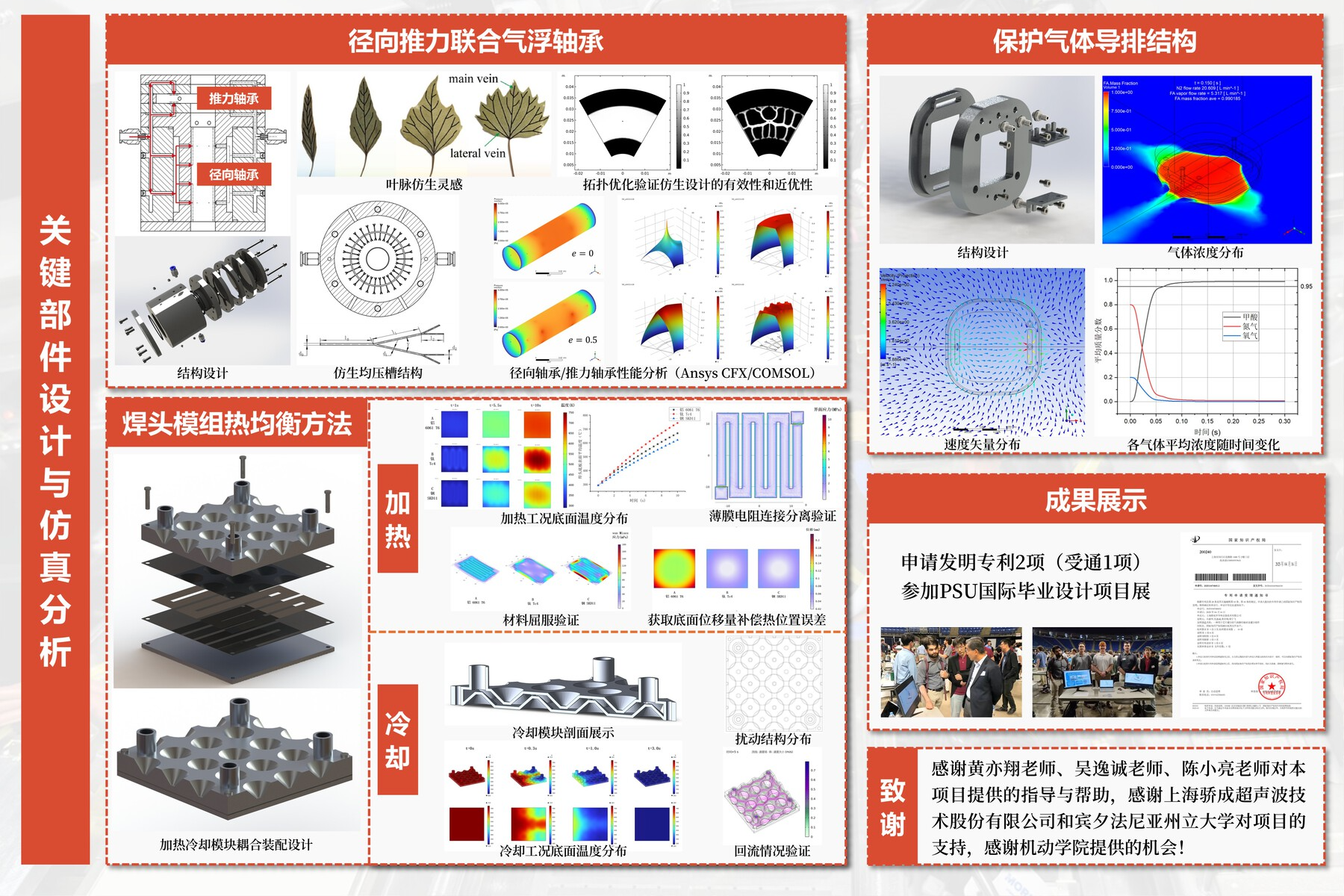 本项目设计与开发了一套多自由度焊头模组,能够利用高精度运动控制系统达到一定的重复定位精度和XY轴共面度要求。同时,在整套装置中引入加热冷却模块,提出了兼顾升温响应与散热效率的热控方案。此外,通过对于保护气体导排结构与气浮轴承的设计开发,提出了高效导气路径方案以及仿生均压槽结构的气浮轴承设计,实现焊头局部气体环境的调控与高性能非接触支撑。目前,本项目有两项发明专利,分别是《一种用于芯片键合的气体静压轴承及键合组件》(专利申请已受理)与《集成于芯片键合焊头模组中的加热冷却装置》(已提交发明专利申报材料)。