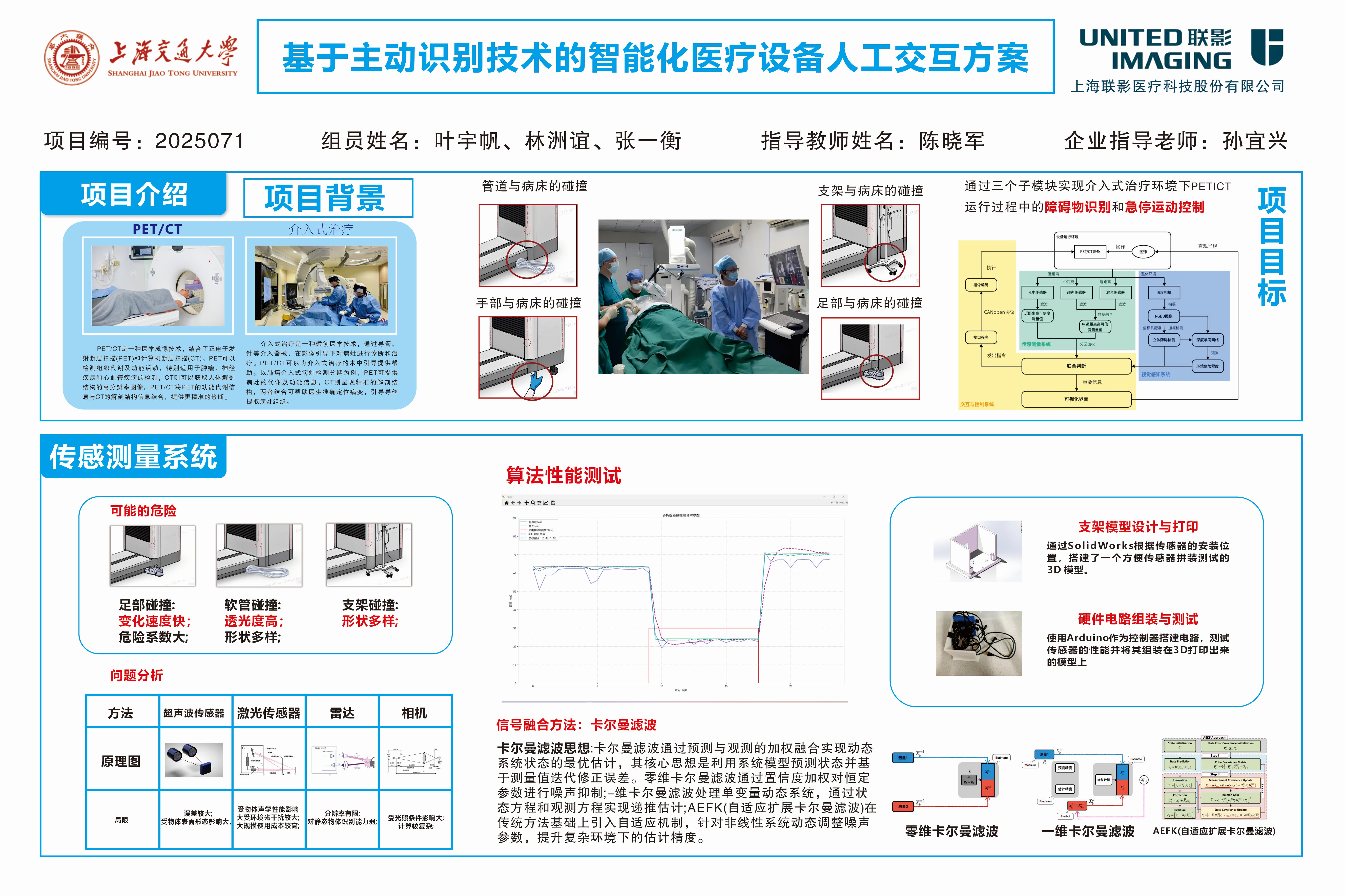本毕业设计项目基于PET/CT设备在临床介入操作中存在的典型安全问题——设备移动路径与医护人员或患者支撑结构之间可能产生碰撞风险。考虑到常规硬件系统在感知透明物、近距离物体等方面的局限,我们尝试搭建一套多传感器融合系统,结合了光电、激光、超声等不同类型传感器,覆盖大范围的感知区间。此外,系统还引入了双目深度相机,并围绕RGB-D数据设计了前景分割和遮挡剔除算法,主要解决支撑结构等非危险目标的误识别问题。在控制层,通过CANopen协议完成与底层伺服的通讯控制,结合人机界面,形成完整的感知—决策—执行闭环。整个系统在联影的实际测试平台上完成验证,系统性能稳定,满足对识别率、避撞率等多个关键指标的要求。