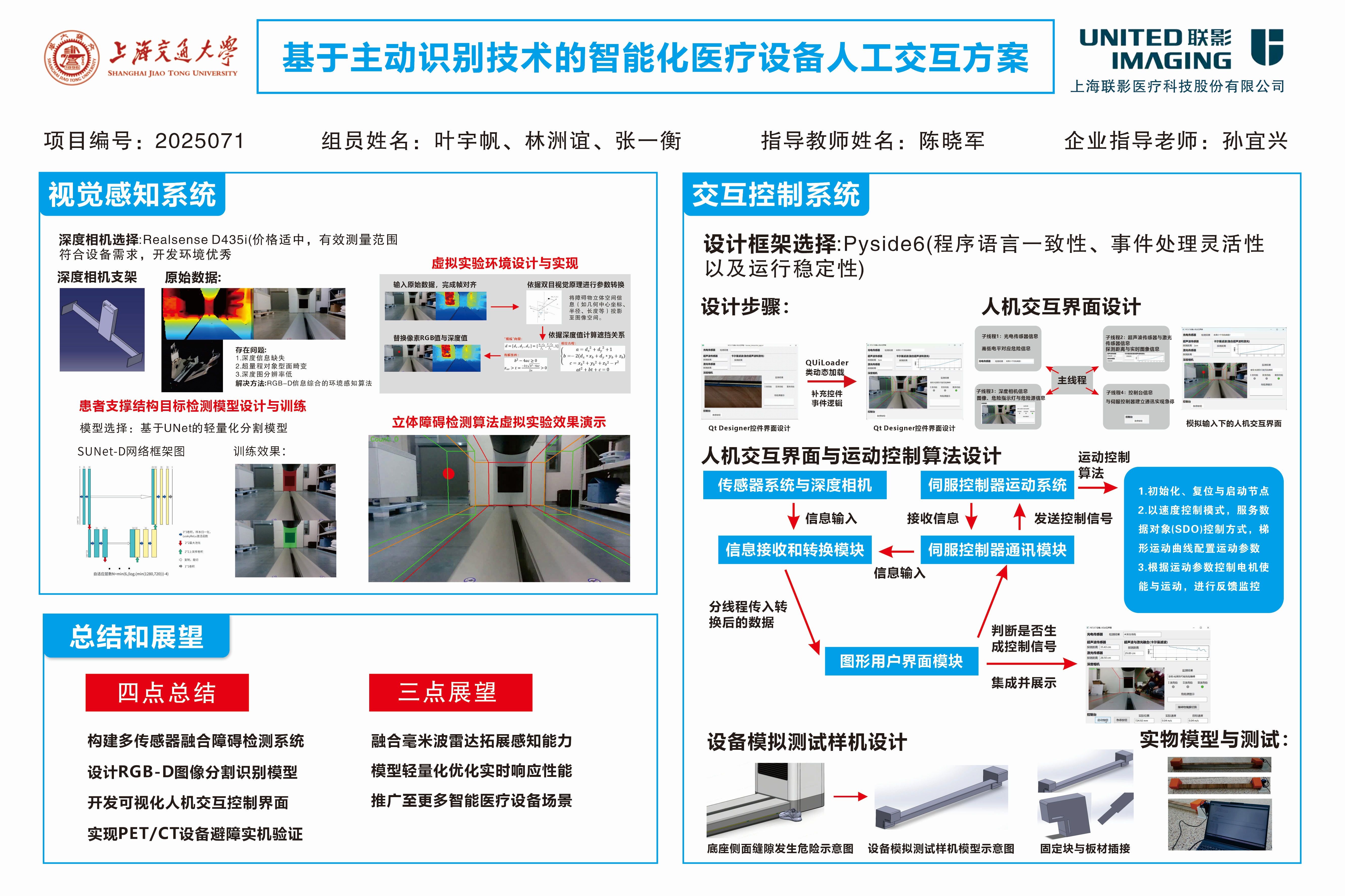 项目最终实现了一套集感知、识别、交互与控制于一体的智能避障系统,并在真实医疗设备上完成了部署与验证,体现出优异的系统性能和应用前景。在感知层面,项目成功集成光电、激光和超声波三类传感器,形成覆盖近远距离的多模态障碍检测网络,结合深度相机提供的RGB-D信息,实现对复杂医疗场景中透明或非规则障碍物的稳定识别。在算法方面,团队自主提出融合RGB-D信息的轻量化图像分割模型SUNet-D,并配套设计双阶段立体框障碍检测策略,实现对患者支撑结构的精准识别与自动屏蔽,极大提高了系统整体识别精度与稳定性。在控制与交互方面,开发了基于PySide6的图形化人机界面,并完成与底层CANopen总线通信协议的集成,实现对伺服电机的有效控制与制动响应。系统已通过在联影医疗平台上的实机联调,达到了制动平稳、安全防护可靠、用户交互友好等多项性能指标,为后续医疗场景中智能化交互系统的推广应用奠定了坚实基础。