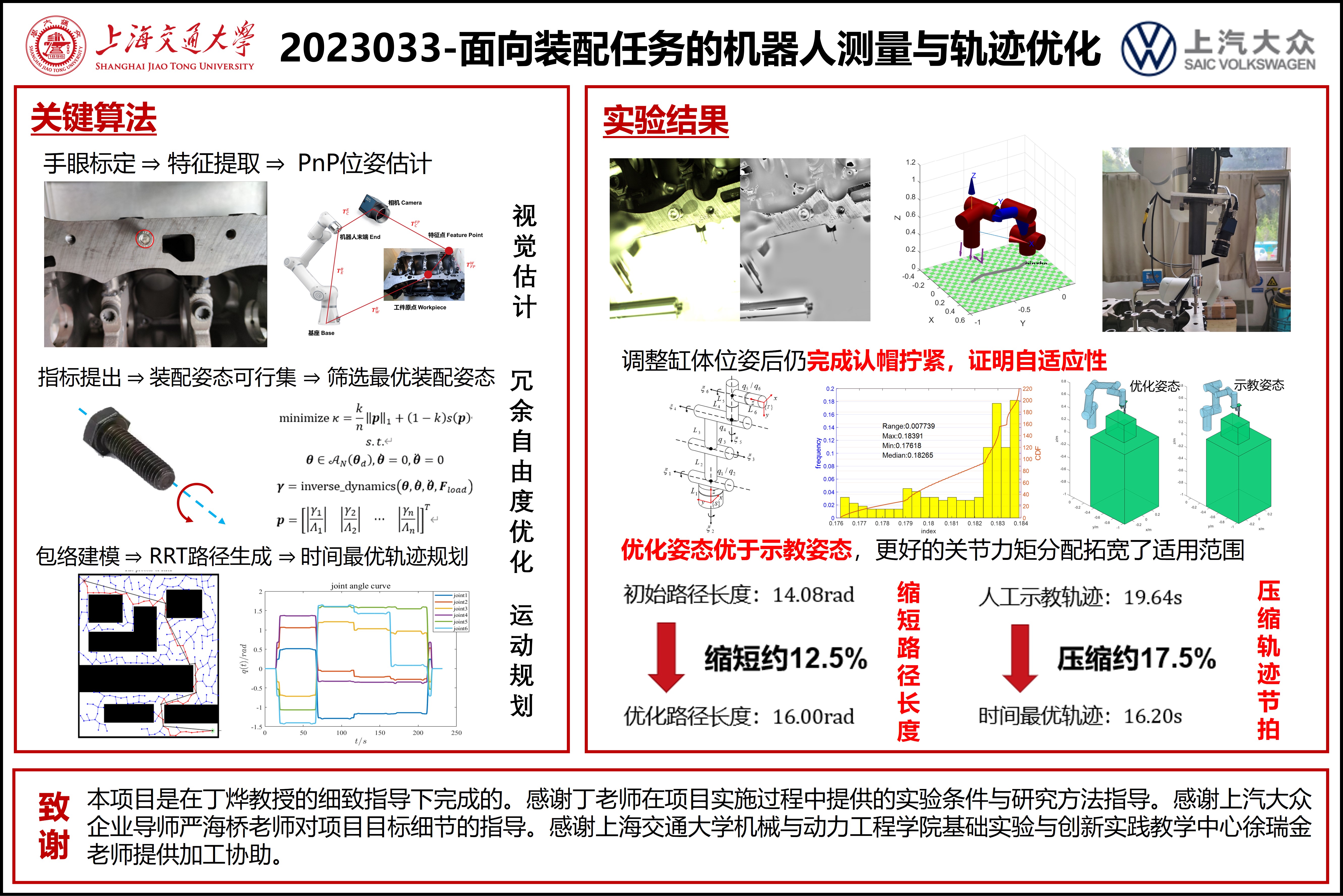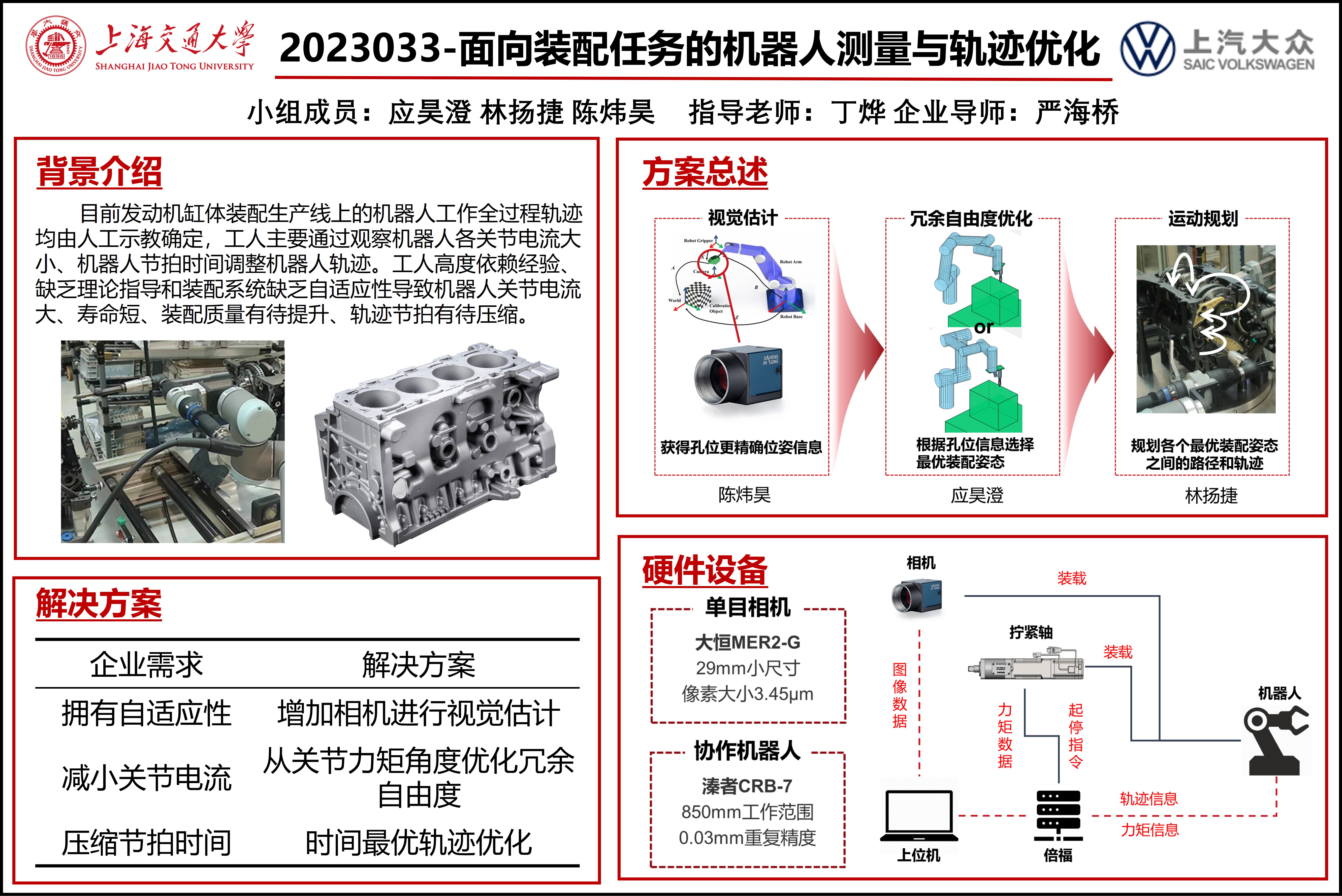 本项目源于大众在生产过程中遇到的一个实际问题:目前发动机缸体装配生产线上的机器人工作全过程轨迹均由人工示教确定,工人主要通过观察机器人各关节电流大小、机器人节拍时间调整机器人轨迹。工人高度依赖经验、缺乏理论指导和装配系统缺乏自适应性导致机器人关节电流大、寿命短、装配质量有待提升、轨迹节拍有待压缩。本项目拟面向发动机缸体装配场景优化机器人工作轨迹,通过视觉方式获得更精确工件位姿信息;优化关节力矩,以减小关节电流;根据孔位分布信息规划整条装配路线,完成装配任务并提高装配生产效率。