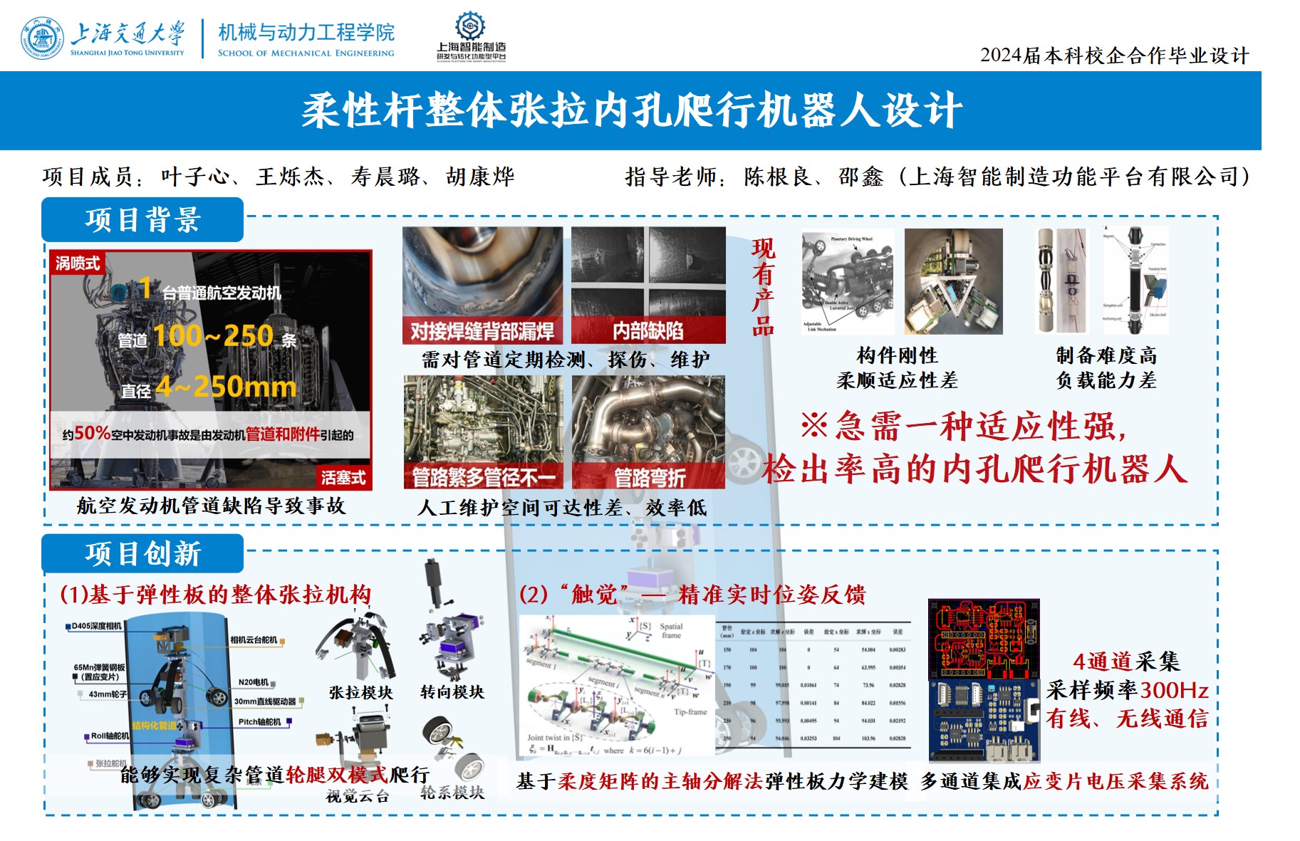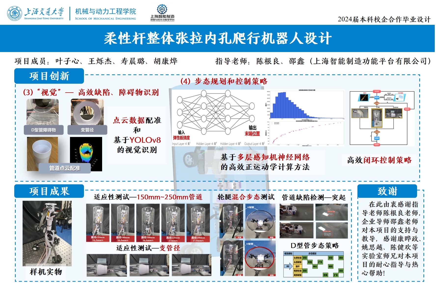 在航空航天飞行器的发动机等复杂系统中,包含大量直径曲率不同、输送水、气的管道。为避免事故发生,管道需定期检测、探伤、维护。内孔爬行机器人可以代替人员进入狭窄危险的管道进行探测,而适应性强、检出率高是这类机器人的核心要求。本项目将弹性板引入机器人设计,利用弹性板大变形和整体张拉构型设计制造一款新型内孔爬行机器人,能够实现复杂管道轮腿双模式爬行和管道内障碍缺陷识别。