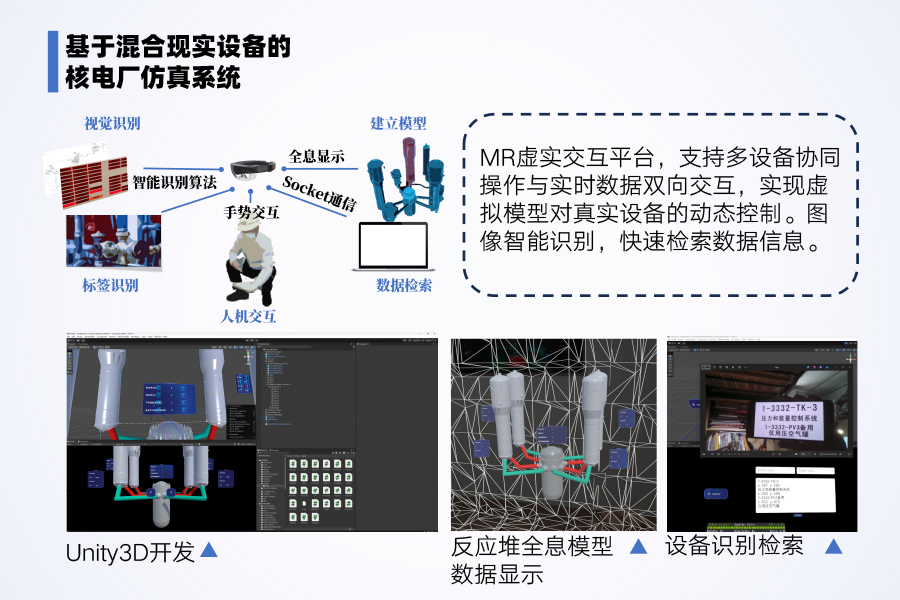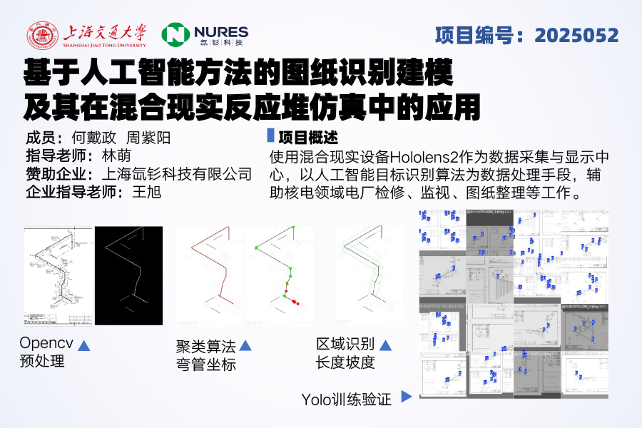 本项目以核能行业数字化转型为背景,聚焦核电站图纸识别效率低、建模流程复杂等痛点,提出“基于人工智能方法的图纸识别建模及其在混合现实(MR)反应堆仿真中的应用”。项目由365英国上市公司官网365英国上市公司官网与上海氙钐科技有限公司合作开展,旨在通过深度学习技术(如YOLO算法)实现核电站图纸的自动化识别与建模,并结合MR技术构建虚实交互的仿真平台。具体内容包含两部分:一是开发图纸智能解析系统,自动提取管道布局、设备参数等关键信息并生成三维模型;二是基于HoloLens2设备实现多机协同、实时数据交互的MR仿真应用,支持核电站设计、检修等场景的虚拟操作。项目通过技术创新推动核能行业智能化升级,助力“双碳”目标实现,兼具工业应用价值和市场潜力。