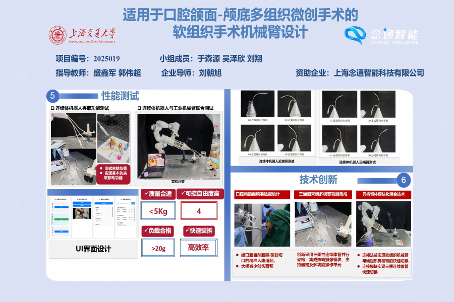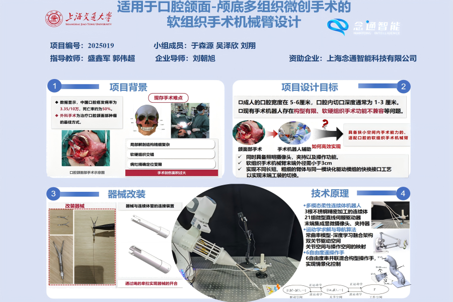 本项目通过进行连续体管的设计与仿真、拓展功能机械结构设计、控制手柄的开发与UI界面设计、连续体运动算法模型建立与求解、视觉标定等,设计了一款适用于口腔颌面-颅底软组织手术的人机协作机械臂。通过连续体运动算法模型建立与求解,该软组织手术机械臂能够实现精确抵达空间中不同位置。在控制手柄的辅助功能下,手术机械臂能够实现丝滑的运动以及末端手术器械的夹持操作。经过实验测试,该机械臂能够实现物体的夹持摆放功能等。