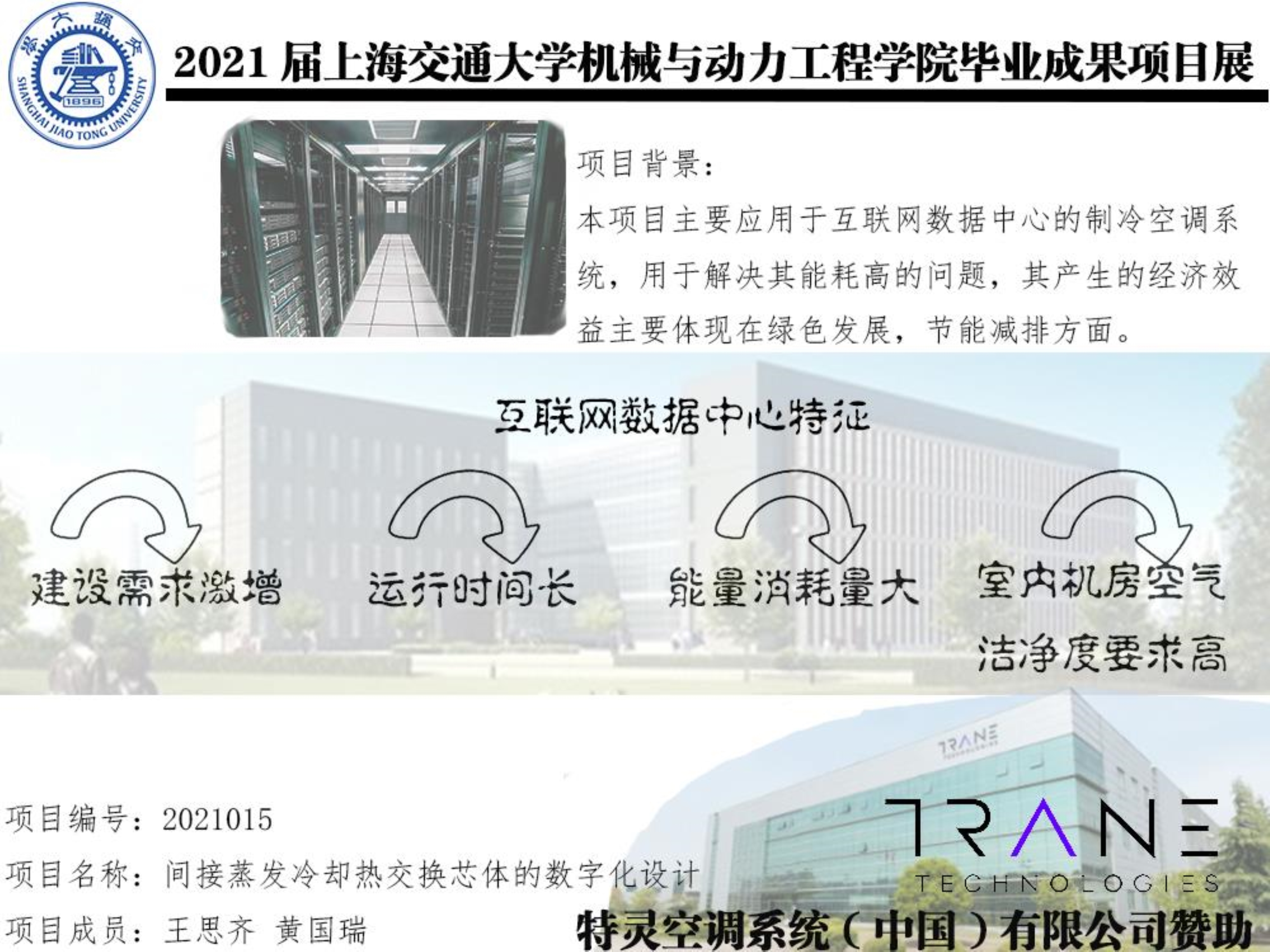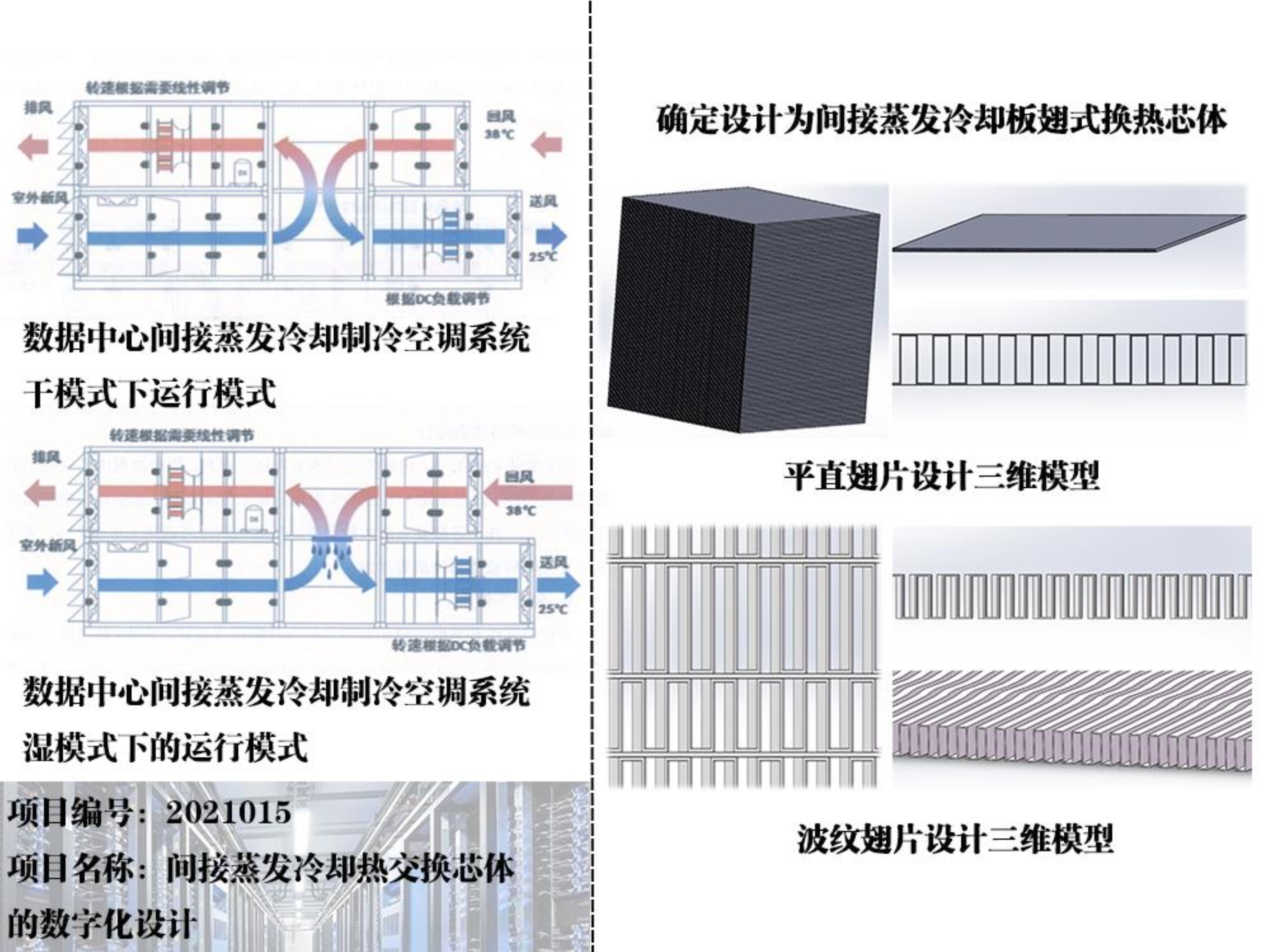 本项目为间接蒸发冷却热交换芯体的数字化设计,由365英国上市公司官网365英国上市公司官网本科毕业设计小组与特灵空调系统(中国)有限公司联合展开。本项目旨在通过调研间接蒸发冷却技术的发展及研究现状,设计出一款利用自然冷能的间接蒸发冷却换热芯体,用于数据中心机房的制冷系统,达到降低数据中心制冷系统能耗的目的。设计的换热芯体需要达到特灵空调系统(中国)有限公司提出的换热效率要求、使用风量要求,并向企业提供结题报告。