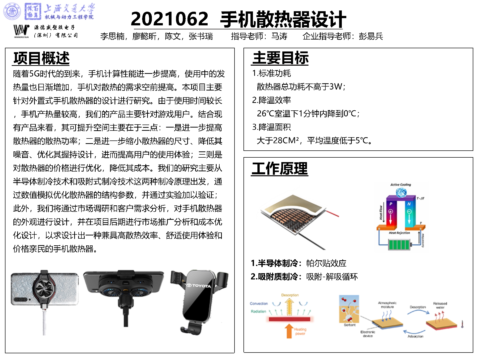 手机内部包含很多发热组件,其散热性能关系到用户的使用体验与手机的使用寿命。同时随着5G技术的发展,手机发热量也在持续增加。因此,新的手机散热技术需要被发展和应用,手机外置式散热器便是其中的一个方向。目前市面上利用了“帕尔贴效应”的半导体制冷散热器散热速度快、制冷效果好,并且可以达到远比环境温度要低的温度,是目前手机散热外置设备的最优解。本项目将基于半导体制冷技术对市场上手机散热器的性能进行进一步优化,同时探索吸附式制冷技术在散热器上应用的可行性。