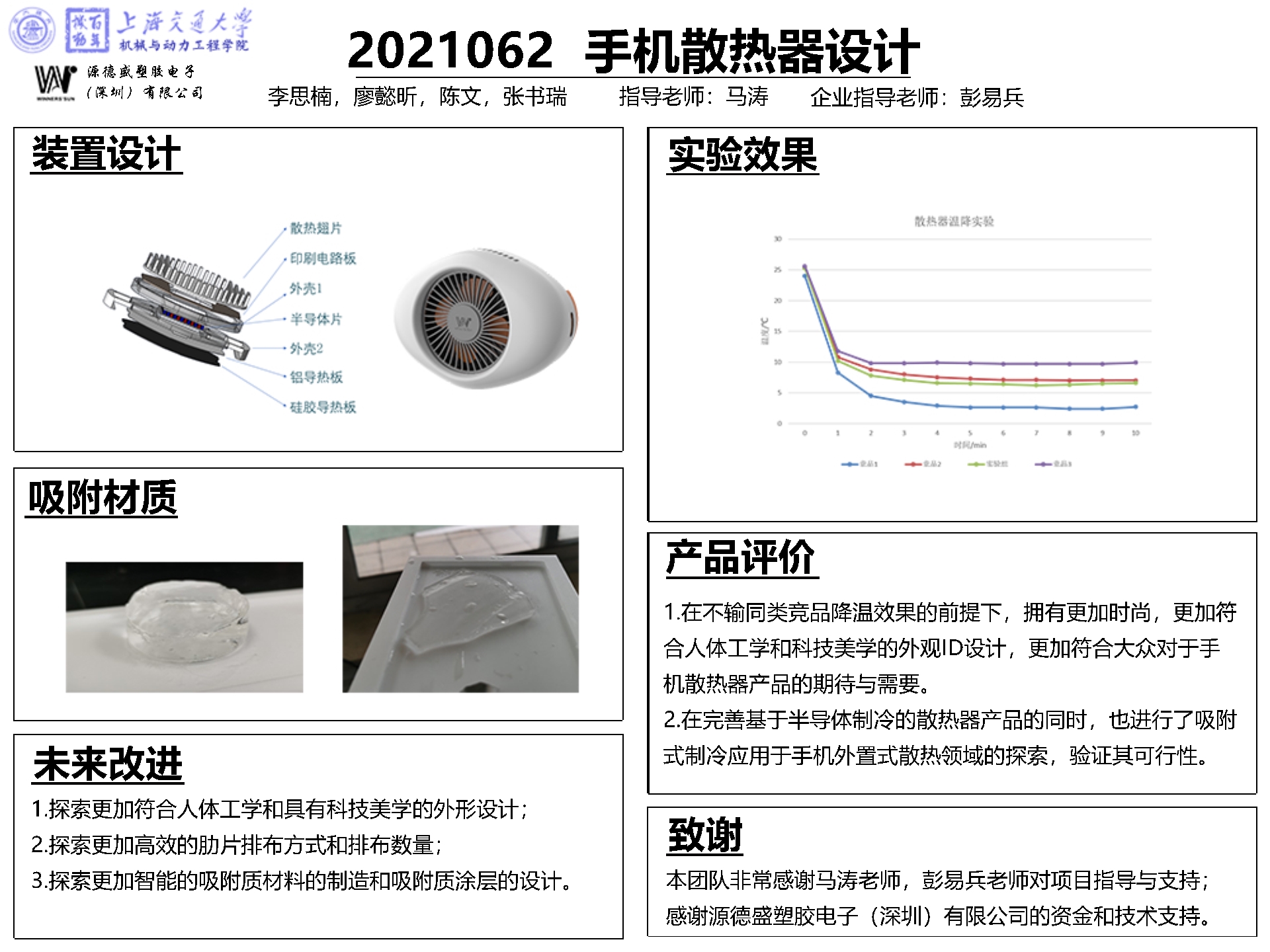 在本项目中,我们进行了用户需求分析和市场竞品分析,并基于分析结果,设计了基本的散热器模型和外壳。同时在仿真优化部分,我们构建了半导体制冷片的仿真模型,并在此基础上进行了整体产品模型的构建与仿真,提出了产品的散热性能分析指标,并基于该模型对产品的材料和散热翅片进行了优化设计;同时我们也对风扇的噪音进行了优化分析以此提高用户的使用体验。在项目后期,我们根据所优化的模型制造了实物样品。此外,我们还进行了吸附式材料的相关实验,以探索吸附式制冷在散热器领域应用的可行性。
