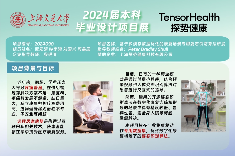 目前,已有的一种商业模式是通过付费小程序,结合预录视频和人体姿态识别算法对患者进行交互式的指导。然而,通用的开源姿态识别算法在数字化康复训练和指导的场景中具有精度较低、鲁棒性差、需全身入镜等问题,亟需解决。本项目致力于收集康复动作专用数据集,设计并优化数字化康复场景下的姿态识别算法。