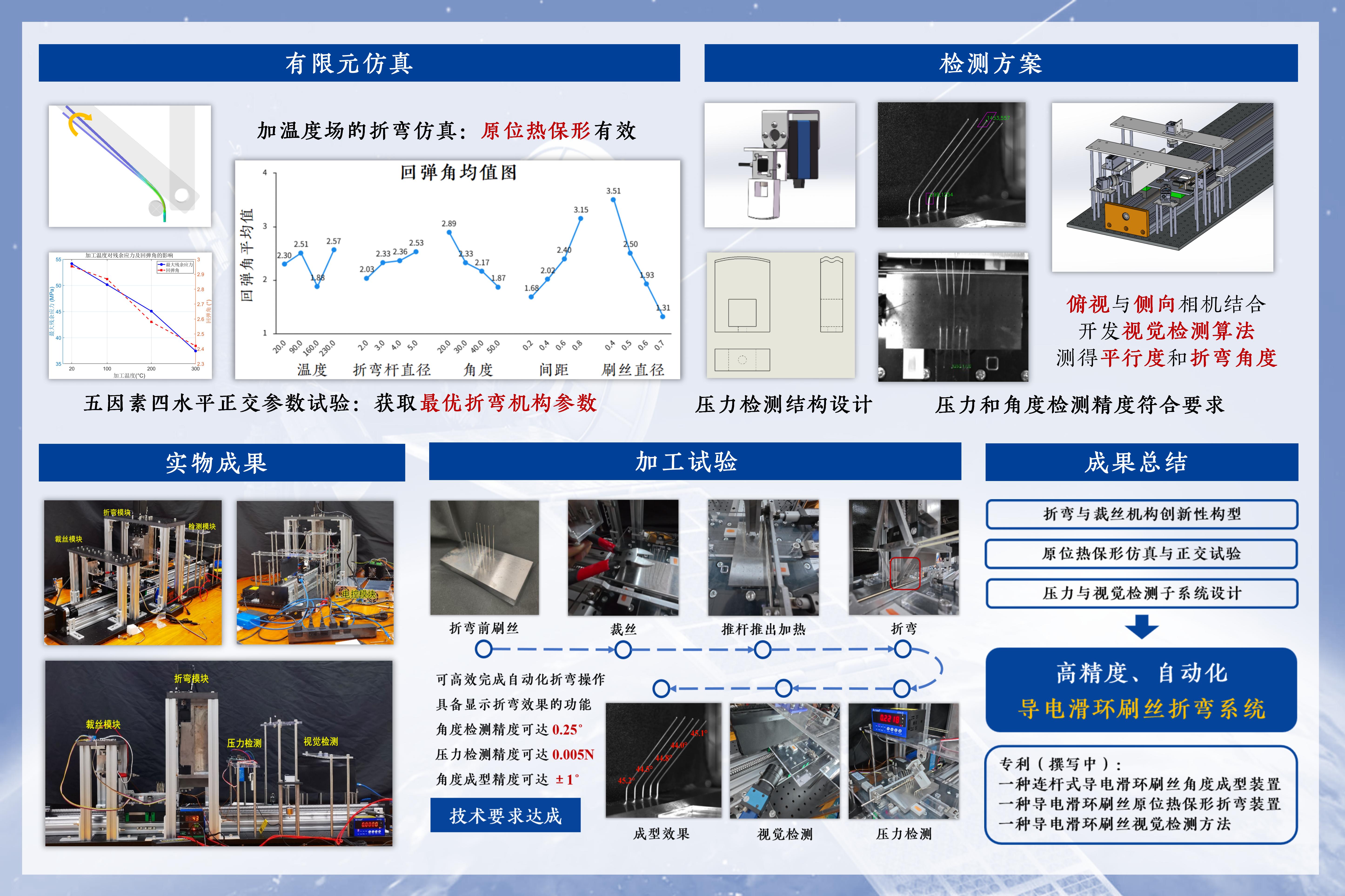 针对任务需求和刷丝折弯高精度与自动化的项目难点,本项目提出基于曲柄滑块机构的龙门架式径向进给方案用于折弯模块,采用龙门架式十字滑台方案用于裁丝模块。在此基础上,开展了刷丝折弯回弹的有限元仿真与理论分析,验证了原位热保形折弯策略的有效性,通过正交试验优化获得了稳定可行的工艺参数组合。同时,设计了模拟环刷真实接触情况的压力检测系统和结合俯视与侧向相机的机器视觉角度检测系统,实现对成型质量的监测反馈。最终通过仿真优化与实物搭建测试,设备实现了折弯角度精度高、成型一致性好、运行稳定可靠的目标要求。项目成果为导电滑环刷丝折弯工艺的自动化、高精度制造提供了技术支撑,具有良好的工程应用和推广前景。