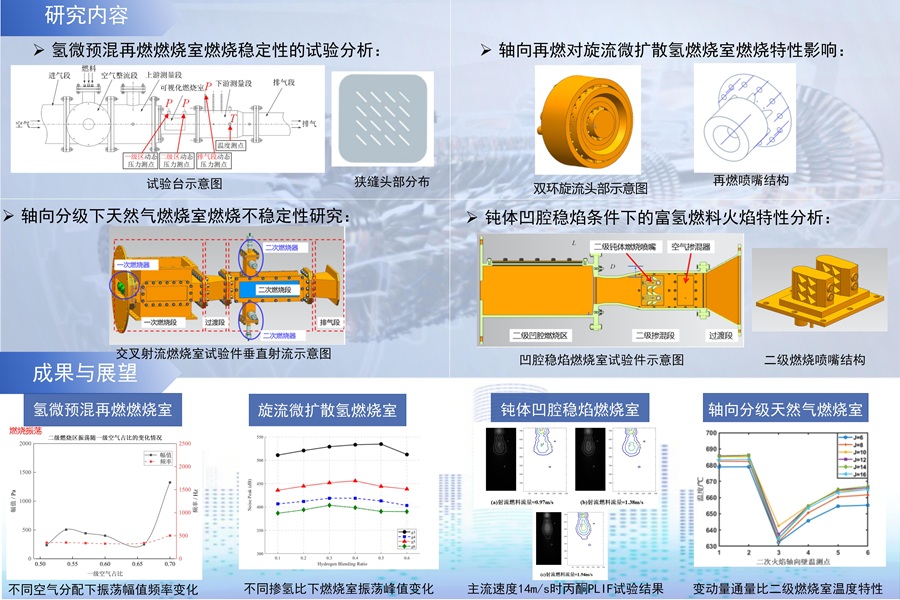 针对轴向分级再燃燃烧室的燃烧特性。本项目总结狭缝再燃与旋流再燃燃烧室对氢燃料火焰燃烧不稳定性的抑制效果以及钝体凹腔稳焰技术对富氢燃料的稳焰效果,并对相应的氮氧化合物排放特性进行了分析。通过对燃烧室火焰图像、温度与压力脉动的试验分析与仿真模拟,掌握了碳氢燃料燃烧条件下的流热耦合机理。为高效低碳燃气轮机燃烧室的国产化设计提供技术支持。