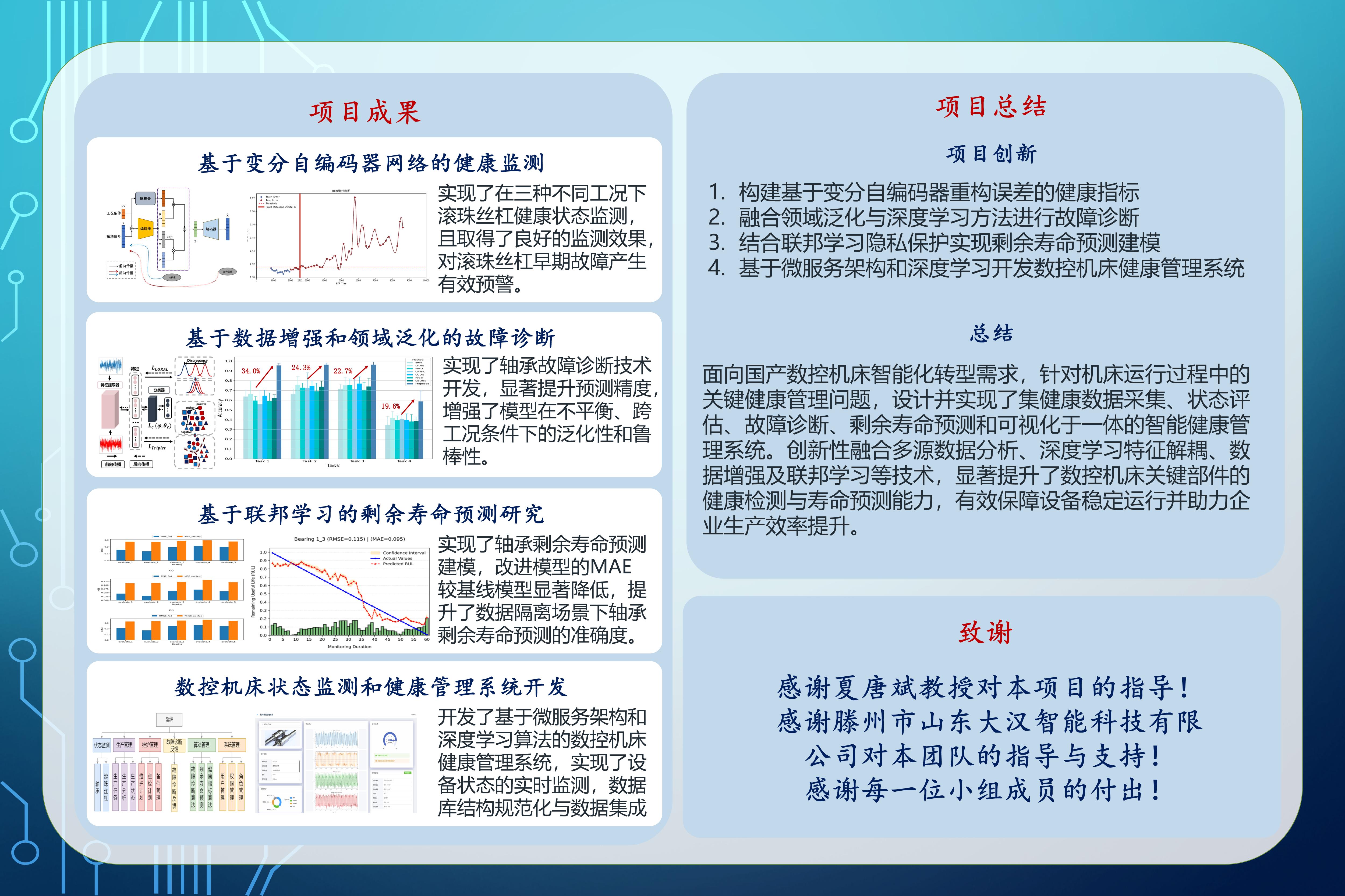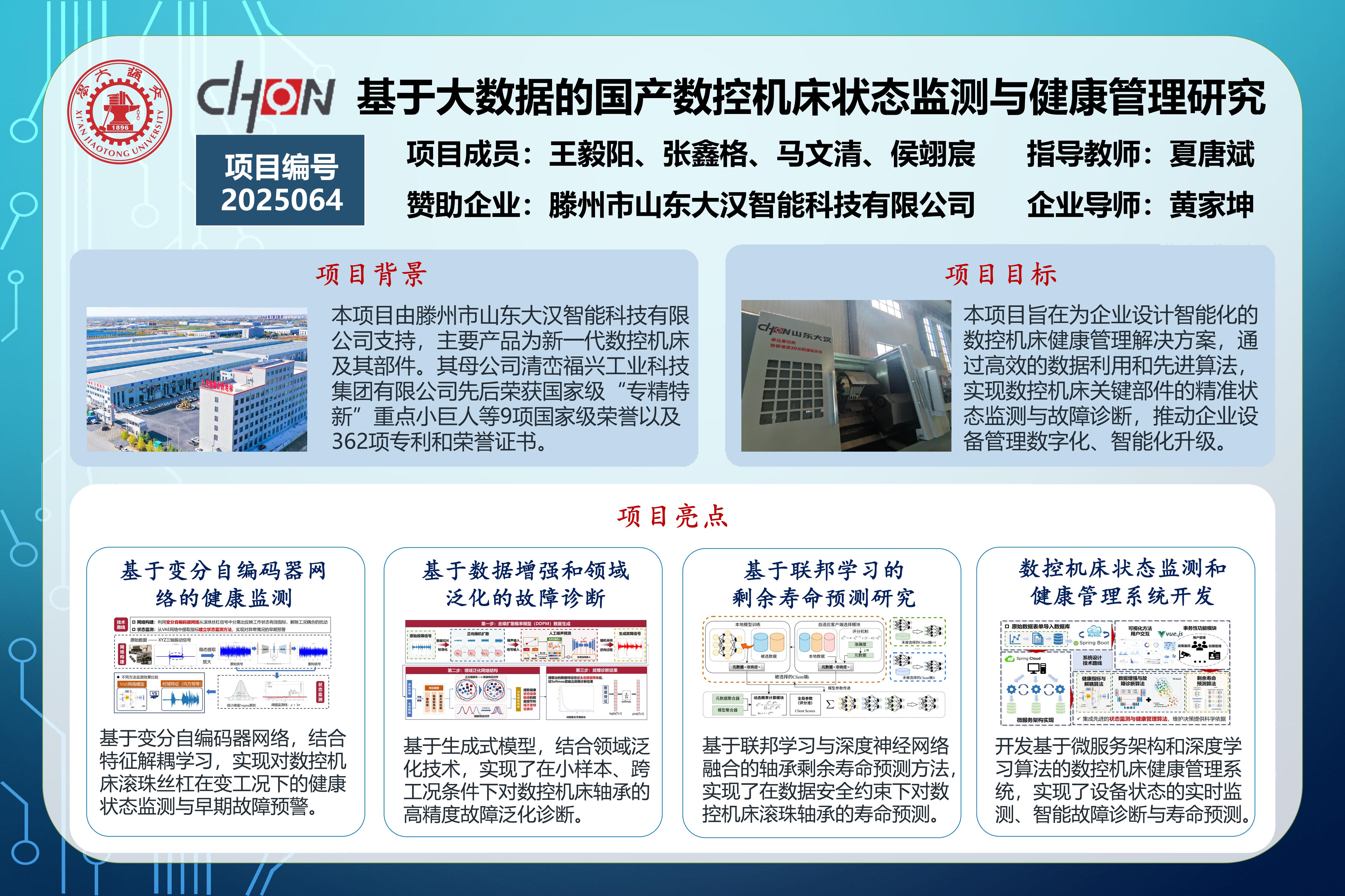本项目受滕州市山东大汉智能科技有限公司赞助支持,其主要产品为新一代数控机床及其部件,致力于将信息技术与制造业深度融合。由于数控机床常在非平稳、高负载的条件下运行,其核心零部件易发生磨损老化,影响加工精度与效率,造成严重的经济损失。因此,通过研究机床关键部件在变工况下的退化过程,建立合适的状态监测和故障诊断方法,构建多层级协同学习框架实现高精度寿命预测,并开发规范且高效的健康管理系统,全面整合数据管理、算法部署和可视化功能,对于保障数控机床的可靠性和安全性至关重要,可以有效辅助运维管理决策,实现智能化升级赋能。