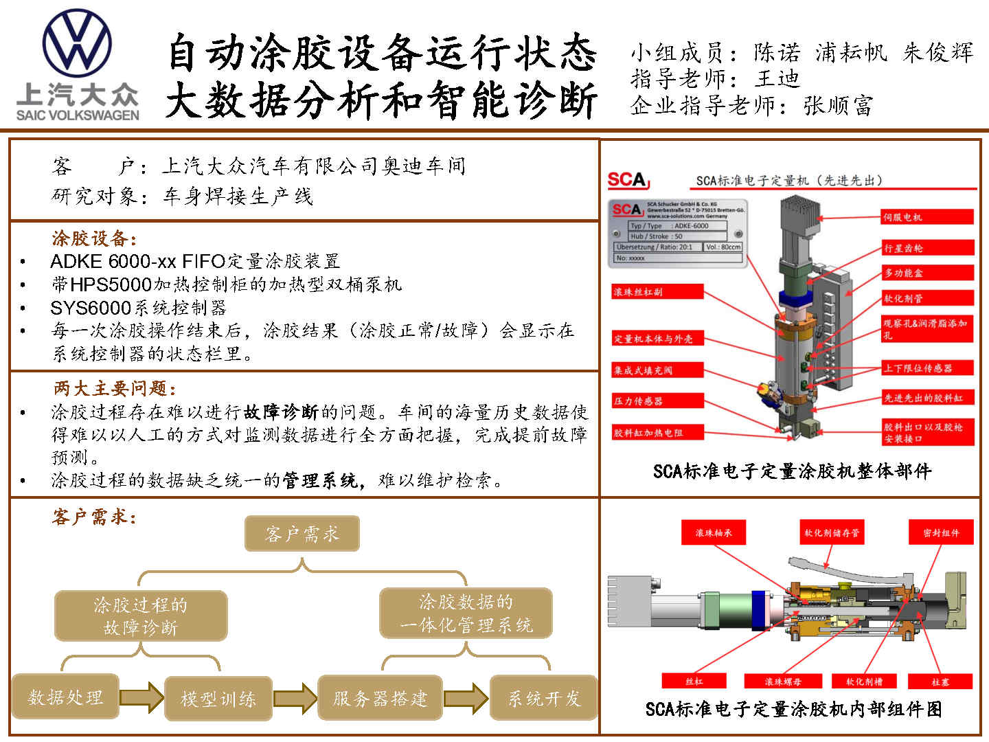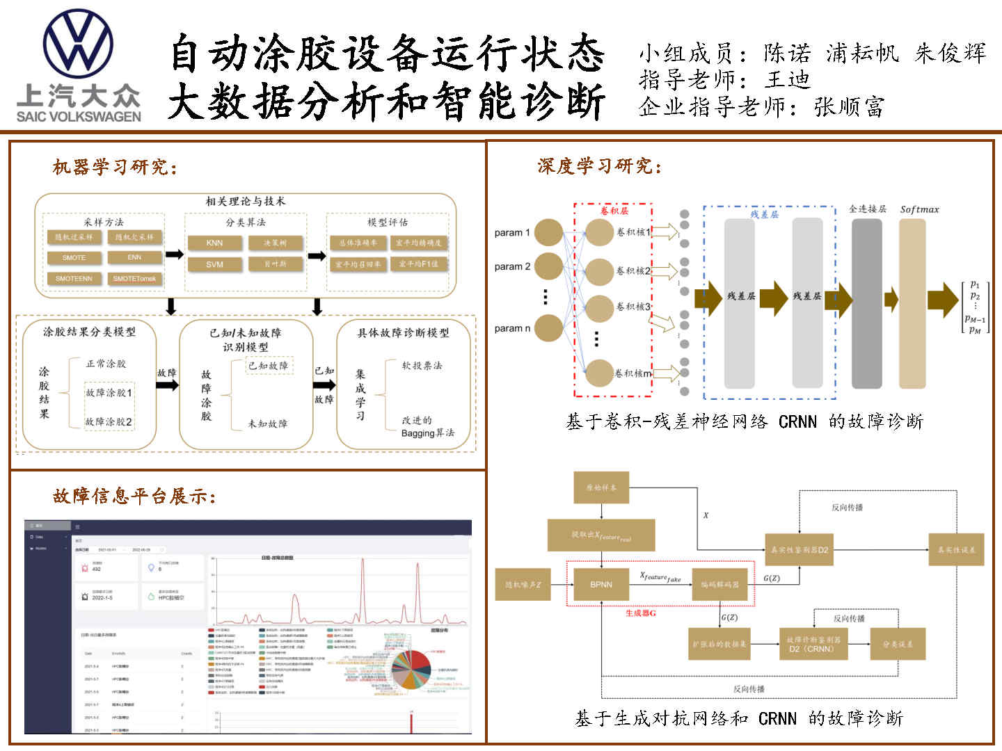 本毕设项目的客户是上汽大众汽车有限公司安亭三厂车间,研究对象为车身焊接生产线。车间生产存在着两大问题,第一是面对海量的历史数据,工程师们难以人工对涂胶过程进行故障诊断;第二是对于涂胶过程的数据,车间缺乏统一的管理系统。本项目在特征提取和特征选择的基础上,利用机器学习和深度学习等方法进行不平衡数据集的处理和分类,并重点分析涂胶故障数据集,实现对涂胶故障的故障诊断。同时,本项目将模型成功的训练、应用包装成用户友好的接口,嵌入到给企业人员开发的信息系统之中,从而让其在浏览器里即可进行实时的模型训练与应用,并得到相应的数据结果与反馈。