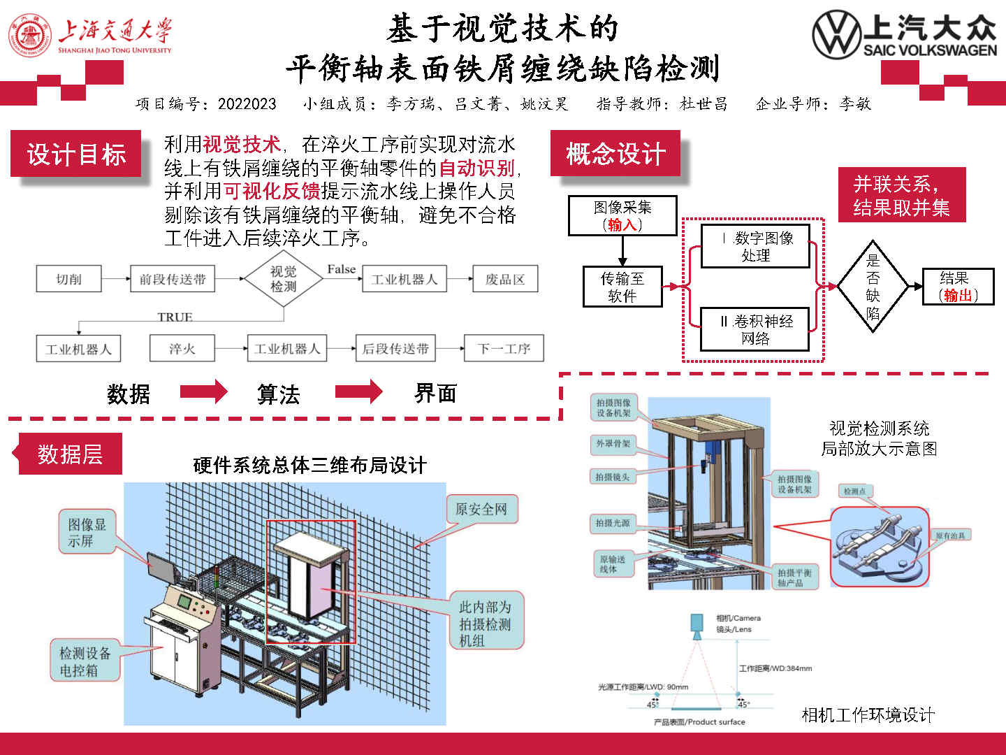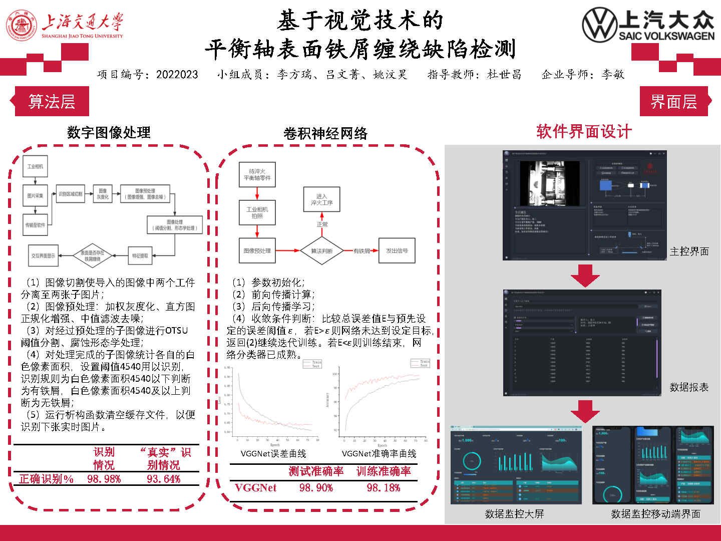 本项目针对企业自动识别平衡轴表面铁屑缠绕缺陷的实际需求,使用数字图像和卷积神经网络两种视觉技术进行互补,最大程度在实现检测自动化的同时保持高准确率,同时设计了配套的软件系统及用户界面,最终较好地完成了企业方自动识别有铁屑缠绕平衡轴工件并提供可视化反馈的需求,避免了依赖操作人员进行人工肉眼识别产线上平衡轴是否存在缺陷的成本高、效率低的情况,解决了工业生产中的实际问题。