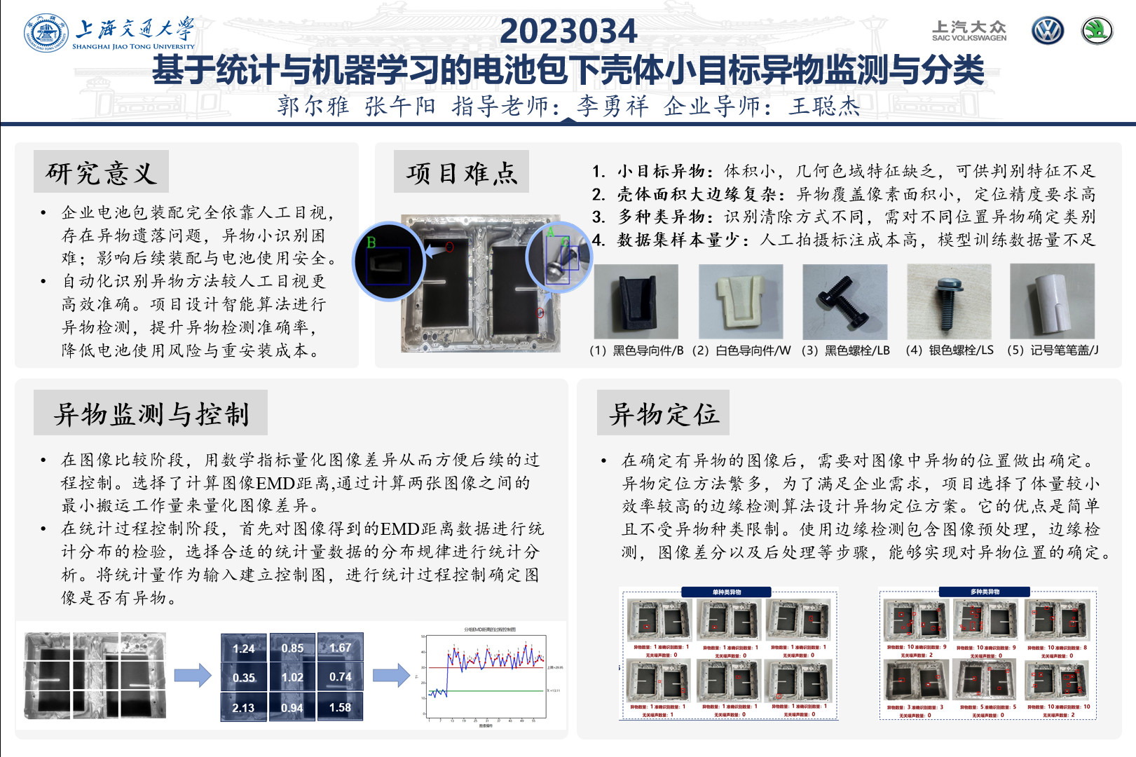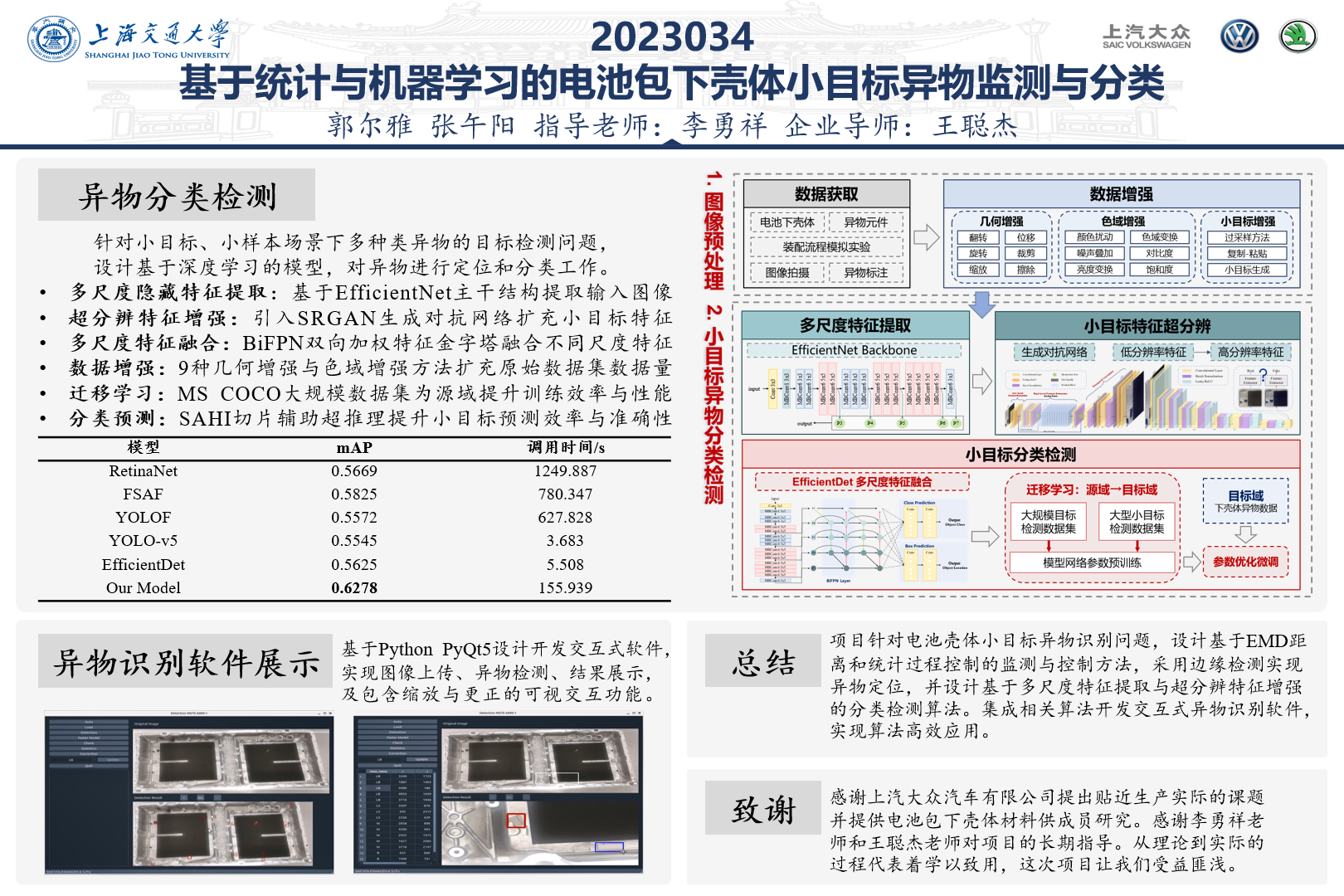 依赖人工目视检查的电池包装配过程异物识别方式易导致异物遗留,影响产品安全并增加生产成本。针对合作企业装配车间异物目标小、可供判别特征缺乏、检测精度要求高的实际异物识别难点,本项目建立基于统计方法的异物监测与定位算法,和基于深度学习算法的小目标异物分类检测框架;并设计开发交互式异物识别软件,使异物识别算法有效地落实到企业生产实际。该算法应用于工位m070,在模组入箱前进行异物监测分类,满足产线生产节拍需求。
