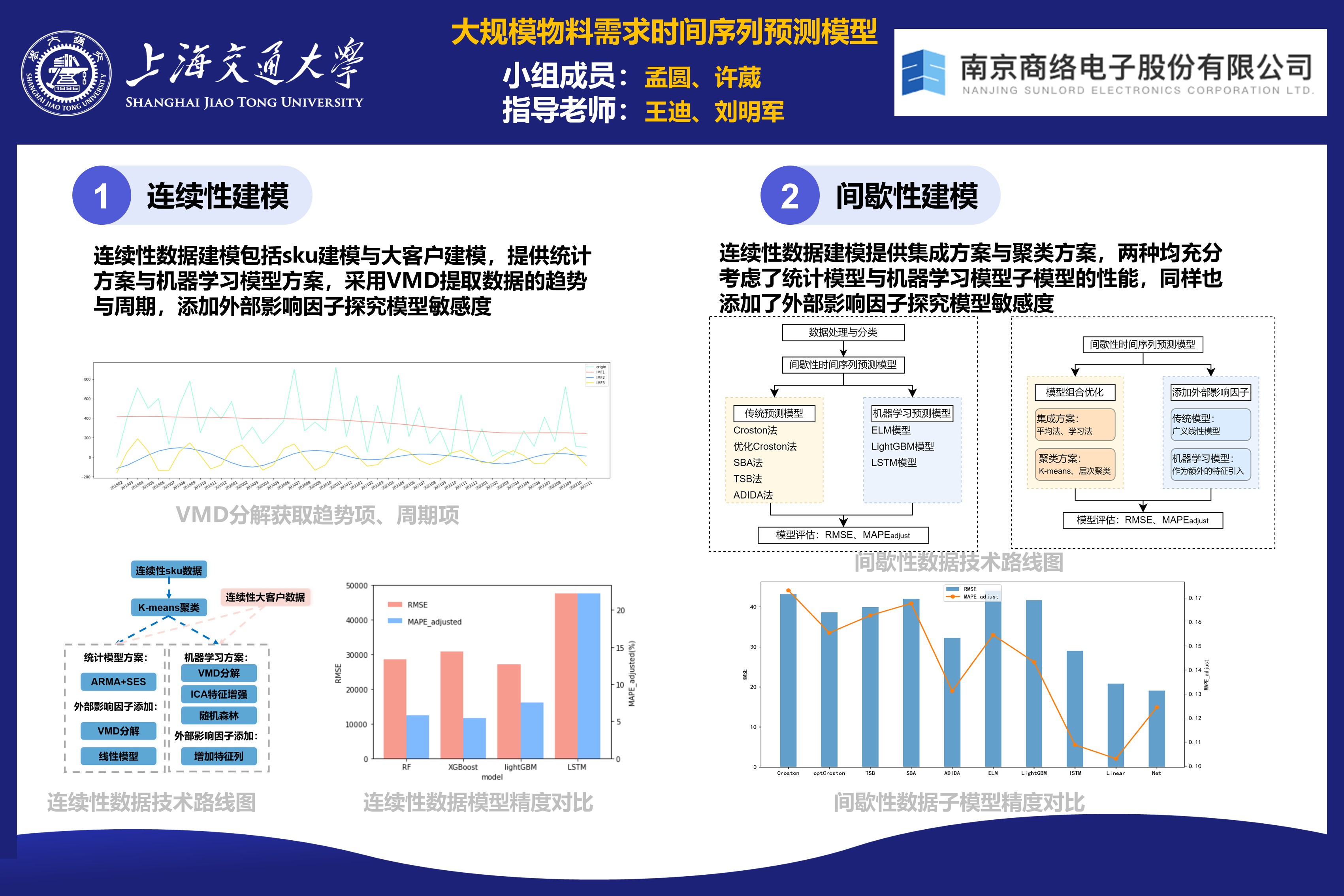 1. 考虑连续性时间序列的物料需求预测研究。通过K-means聚类算法将连续性物料分为三类,采用VMD对数据进行预处理,对数据进行降噪,分离并提取信号分量,以提高模型准确度。预测模型选取了统计学习方法和机器学习方法进行预测,然后在不同聚类数据上评估模型效果。