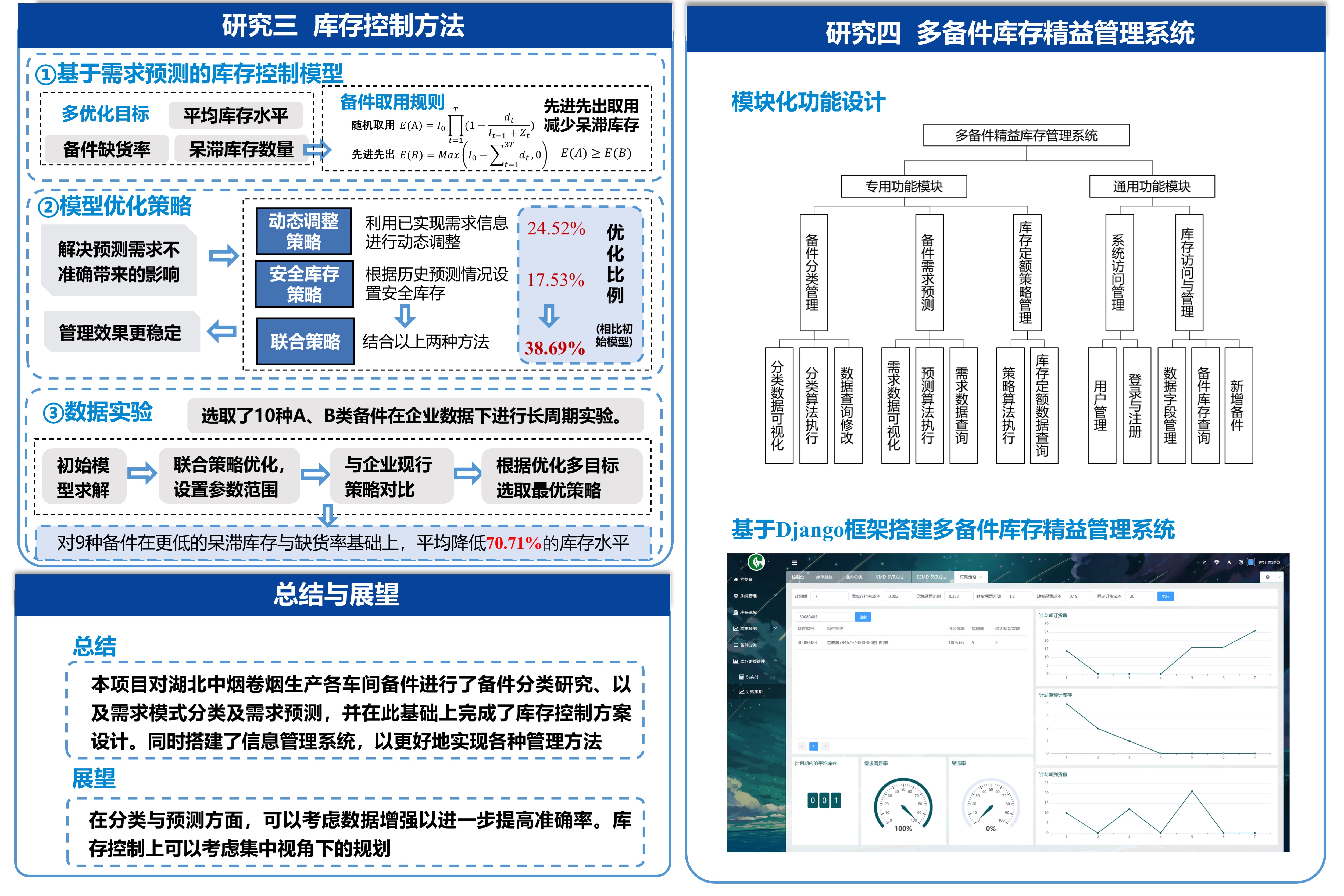 3) 库存控制:根据企业实际需求确定优化目标与约束条件,建立了基于需求预测的库存控制模型并设计了优化方法,通过数据实验进行了效果验证。