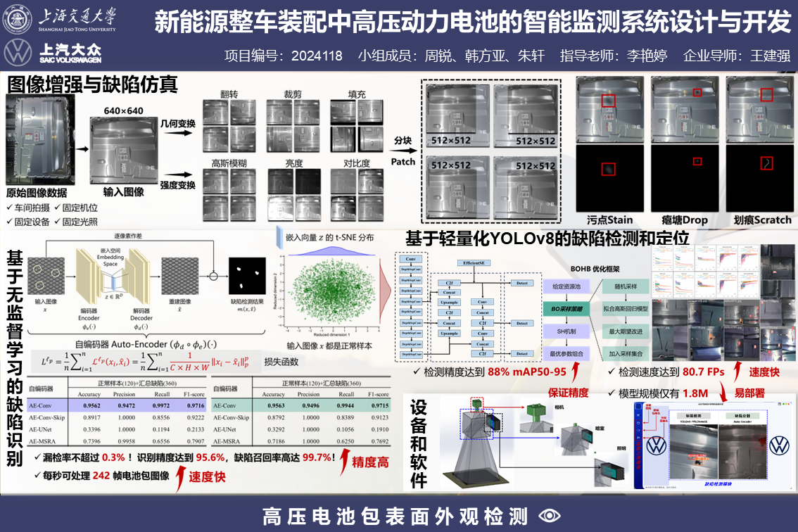 本项目针对当前上汽大众在推动电动汽车产线建设中PHEV高压电池包装配过程中存在的缺陷检测不准确、电检数据利用率低和作业安全风险问题,提出了一套综合机器视觉和数据分析方法的PHEV高压电池包装配全流程自动化监测系统。通过分析电池包生产与装配流程,开发了基于机器视觉和神经网络的外观缺陷检测算法,利用数据分析技术构建了关键性能指标的预测系统,并设计了集成以上功能的自动化监测软件。该系统显著提高了缺陷检测的准确性与作业的安全性,同时通过有效的数据监控与分析,提升了质量控制的效率和响应速度,为上汽大众提供了一套操作简便、数据可追溯的质量监控解决方案,有力支持了企业的自动化转型战略。
