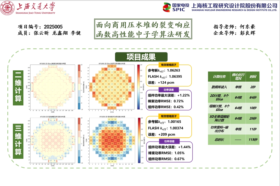 项目成功研发裂变响应函数算法,全堆三维模拟耗时1分55秒,较蒙特卡罗方法效率提升超千倍。关键指标全面达标:k-eff计算值1.00374,偏差209pcm;棒束功率分布均方根误差1.05%,组件功率最大误差1.44%,显著优于确定论方法(5%-8%误差)。技术突破包括:1)建立覆盖11类组件相邻模式的22组CR修正因子库,通过栅元级几何变换实现任意方位耦合效应校正;2)反射层预估-校正法经两次迭代优化,边界中子流分布误差降低至2.7%;3)JSON参数化系统实现输入卡自动生成,30万栅元建模任务无人值守运行,用户操作失误率<1.2%。成果获上海核工院验收,证实算法在复杂几何与非均匀燃耗场景下的工程可行性,为后续瞬态分析及多堆型适配奠定技术基础。