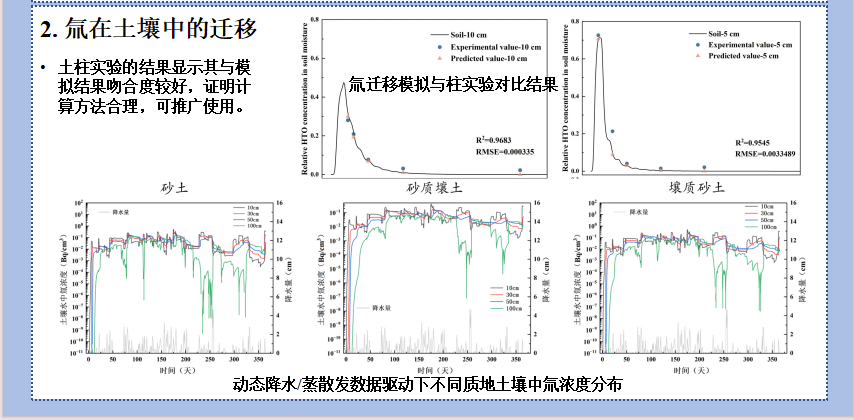 探究了源项、土壤类型、气象条件以及植物种类对氚在土壤中迁移的影响,得到了不同条件对于氚在土壤中的迁移行为的具体影响形式,总结归纳出不同条件对于氚在土壤中的迁移行为的不同影响程度。进行氚的土柱实验,得到实验数据,与模拟数据进行比对,通过对二者的结果进行比对,以确保结果的合理性。