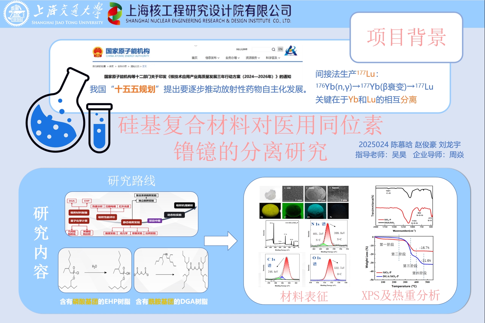 基于177Lu生产的“间接法”工艺,开发一种将无载体177Lu产物从反应后靶件溶解液分离出来的工艺。项目以合成两种硅基复合材料吸附剂,即含酰胺类基团吸附材料DGA与含磷酸类基团吸附材料EHP为基础,通过吸附材料合成、静态试验、吸附材料表征、DFT计算等实验与计算手段探究合适的分离途径,并以此类实验数据为基础进行动态吸附柱实验,灌装离子分离色谱柱,实现分离工艺的开发。