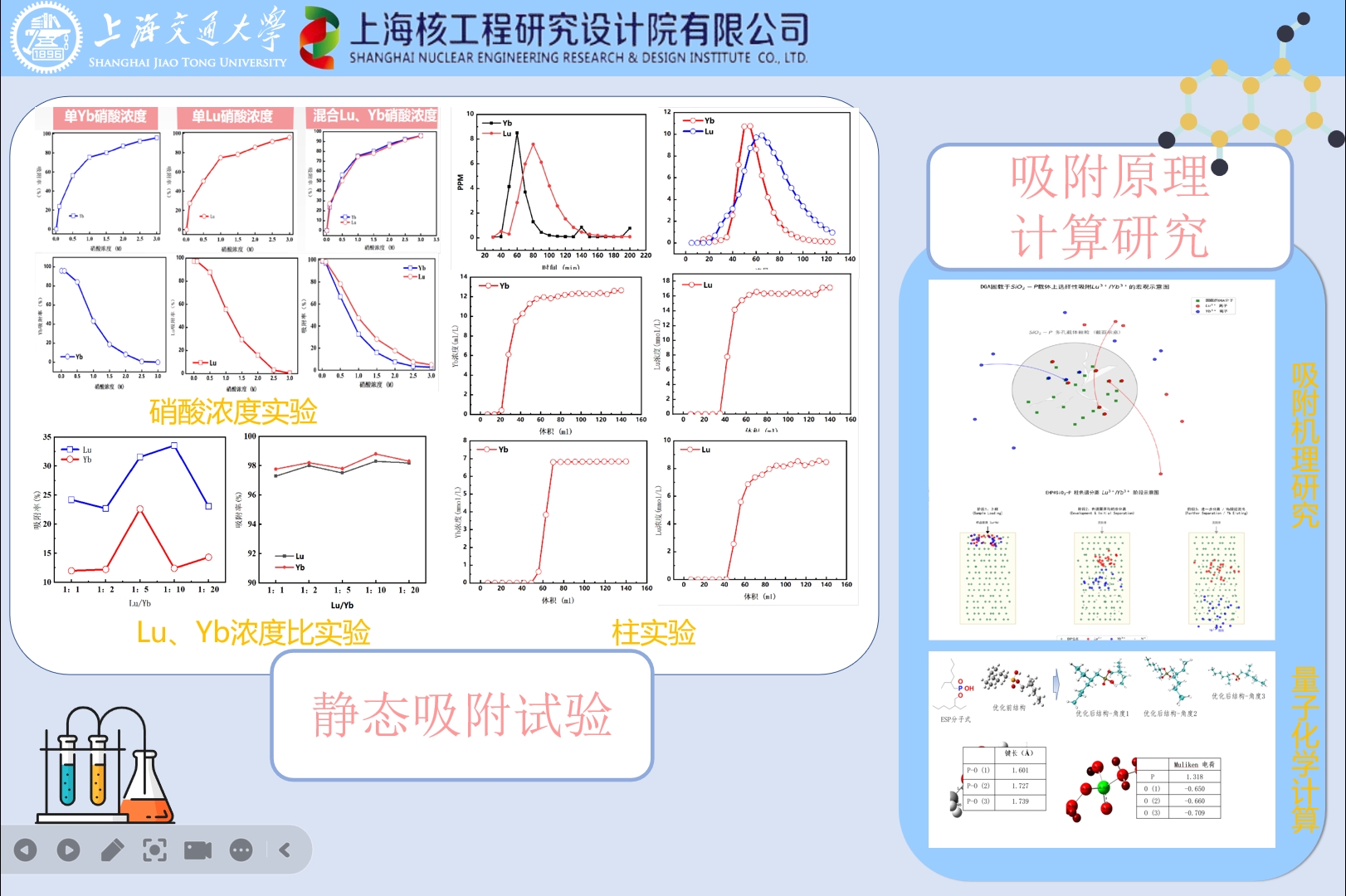通过真空灌装法制备了两种吸附材料,即DGA/SiO2-P与EHP/SiO2-P;综合采用扫描电镜、红外光谱、热重分析等手段对合成材料进行了表征;通过静态吸附试验,对材料进行了不同酸度吸附实验、吸附动力学实验、容量实验等试验,探究了材料的静态吸附性能;通过DFT计算等量子化学计算手段,对材料的结构、吸附机理、吸附行为等进行了探究;综合以上实验成果进行了动态吸附柱实验,验证了工艺流程的合理性,EHP色谱柱对Lu的单次通过的富集度达到了80%以上。