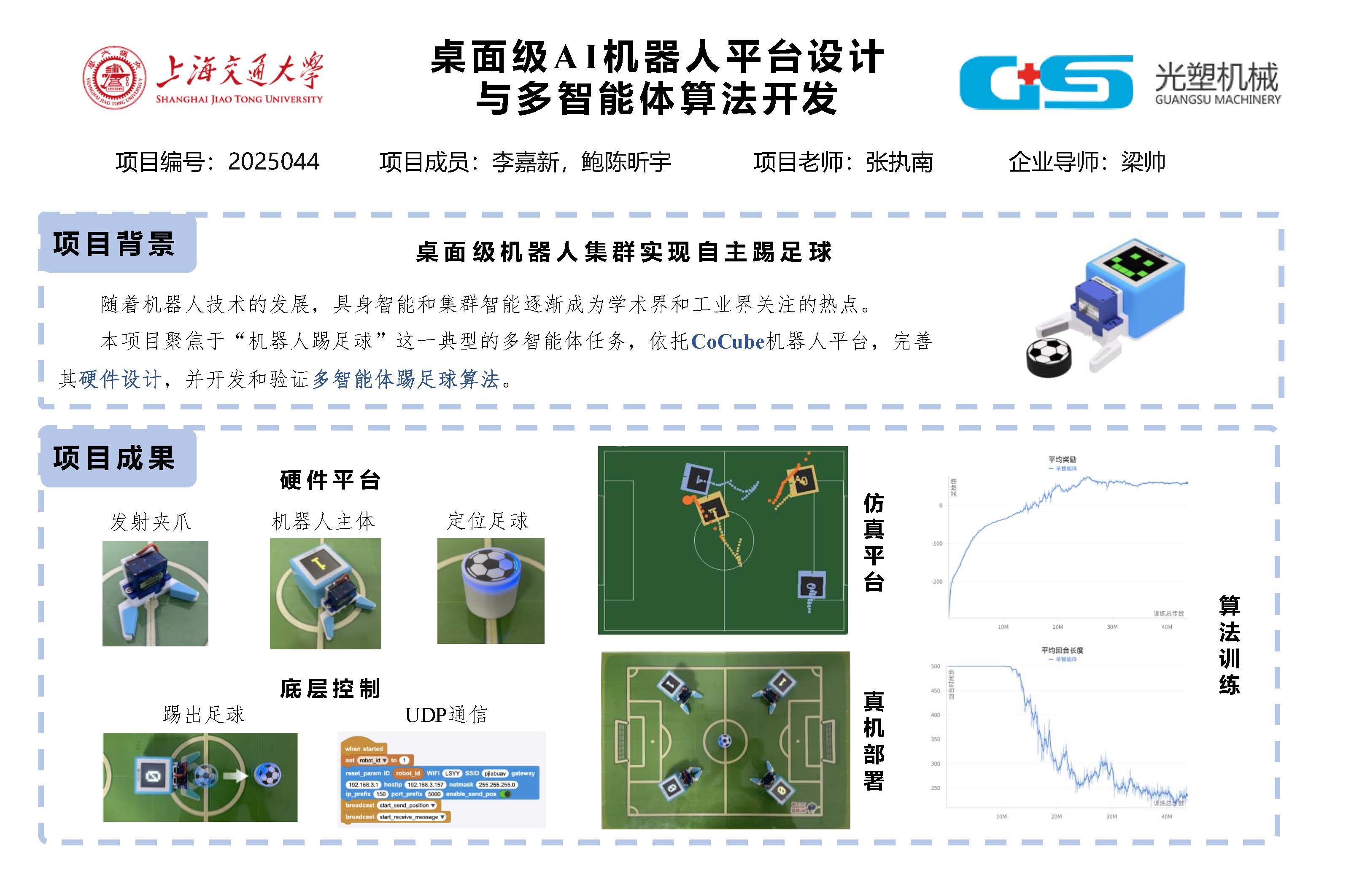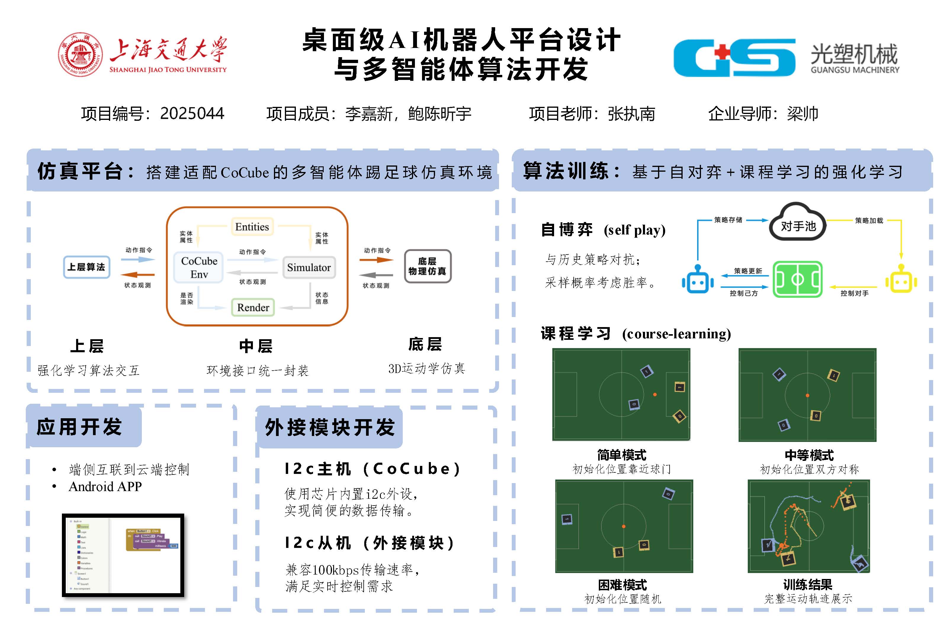 随着移动机器人技术的蓬勃发展,具身智能与群体智能逐渐成为学术界和工业界的研究热点。机器人足球作为一种典型的多智能体协同动态任务,环境变化迅速、反馈稀疏且具有延迟性,因而蕴含丰富的理论价值与广阔的应用前景。本项目以机器人踢足球任务为研究对象,旨在提升机器人在动态场景下的自主决策与团队协作能力。研究内容包括基于相关机器人平台的硬件与外部模块设计、面向 ODE 引擎的高效仿真环境构建,以及强化学习多智能体控制策略的训练与真机部署。