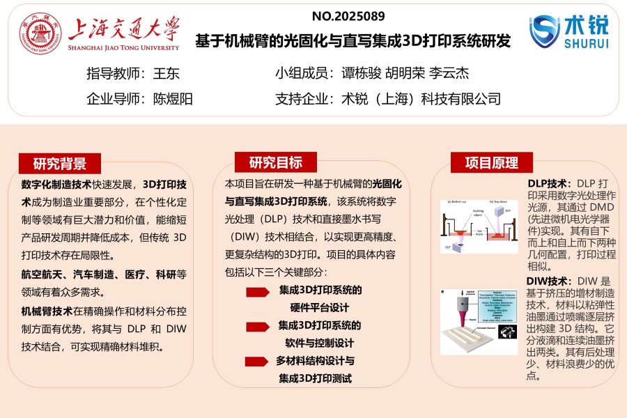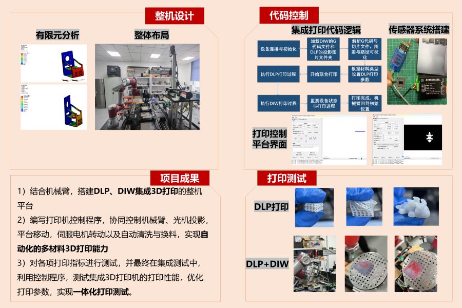 本项目旨在研发一种基于机械臂的光固化与直写集成3D打印系统,将数字光处理(DLP)技术和直接墨水书写(DIW)技术与机械臂技术相结合,以实现更高精度、更复杂结构的多材料3D打印。项目背景源于传统3D打印技术在材料选择、打印精度、速度及多材料打印能力上的局限性,而航空航天、医疗器械等行业对复杂结构零部件的需求日益增长。项目包括硬件平台设计、软件与控制设计、多材料结构设计与集成3D打印测试。硬件设计涵盖DLP和DIW技术的3D打印系统结构设计与部件加工;软件与控制设计涉及打印参数规划、路径轨迹规划及控制平台开发;多材料结构设计与测试关注参数化设计、打印参数优化及性能测试。