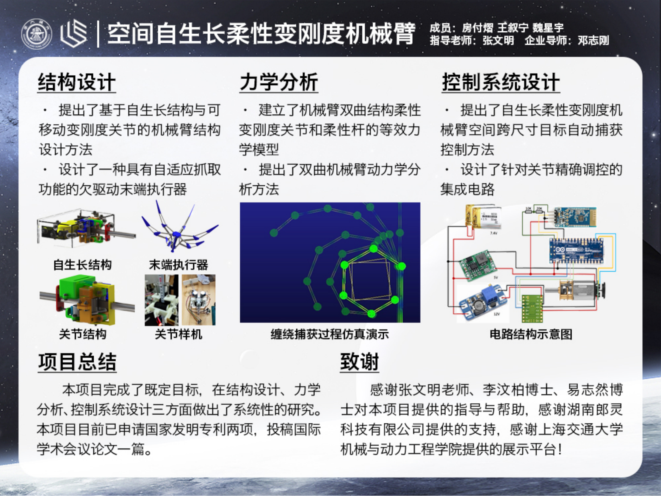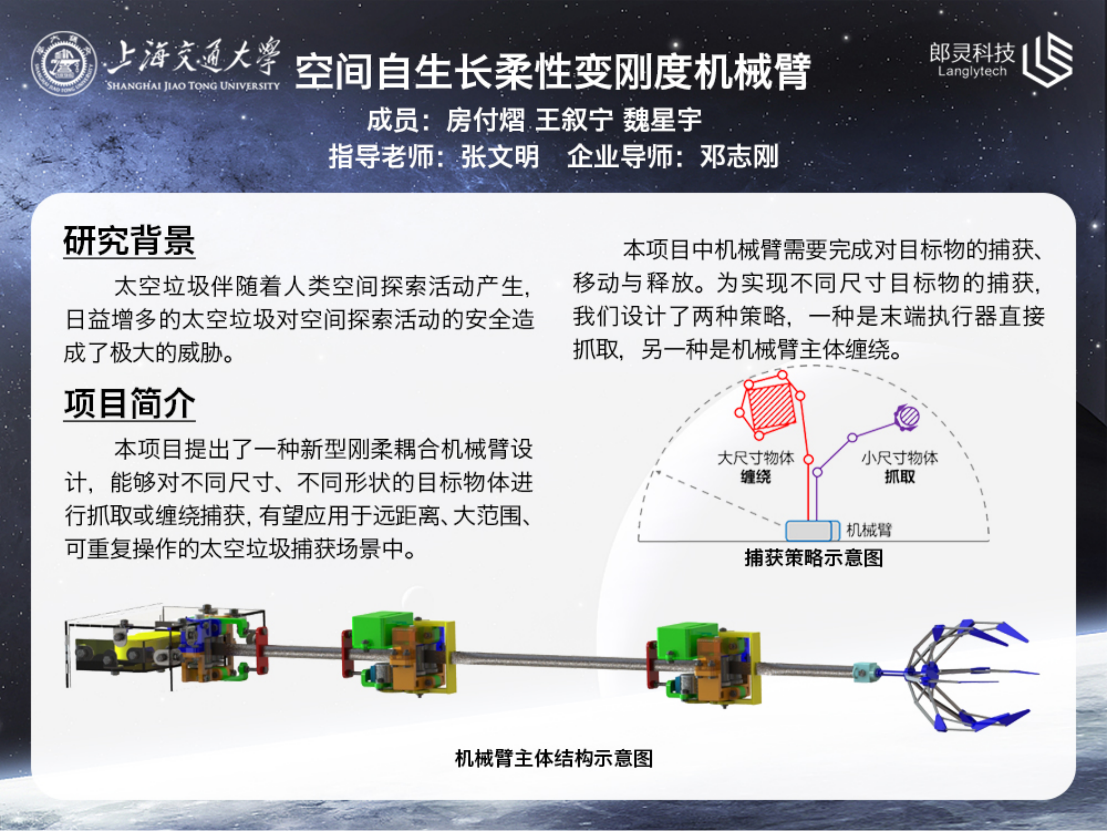 太空垃圾伴随着人类空间探索活动产生,日益增多的太空垃圾对人类太空探索活动的安全造成了极大的威胁。为此,太空垃圾清理成为亟需解决的世界性难题,如何实现多次可重复的目标转移以及自适应、跨尺寸的空间捕获,成为了本项目关注的重点。本项目提出了一种新型刚柔耦合机械臂设计,具有空间自生长、柔性变刚度等特征,能够对不同尺寸、不同形状的目标物体进行抓取或缠绕捕获,有望应用于远距离、大范围、可重复操作的太空垃圾捕获场景中。