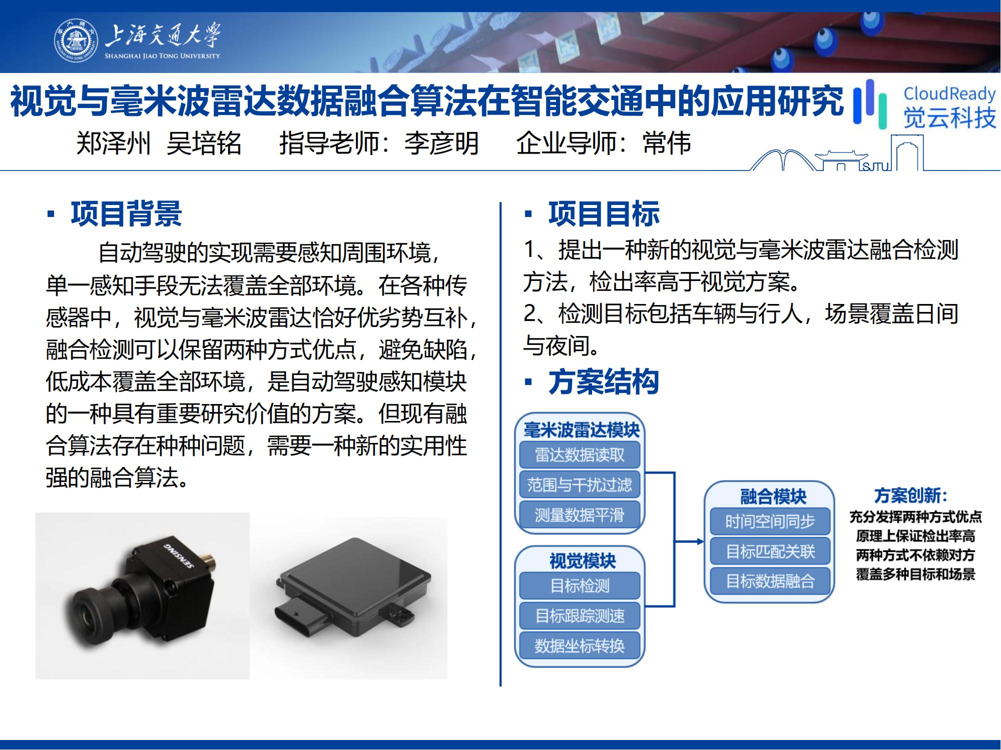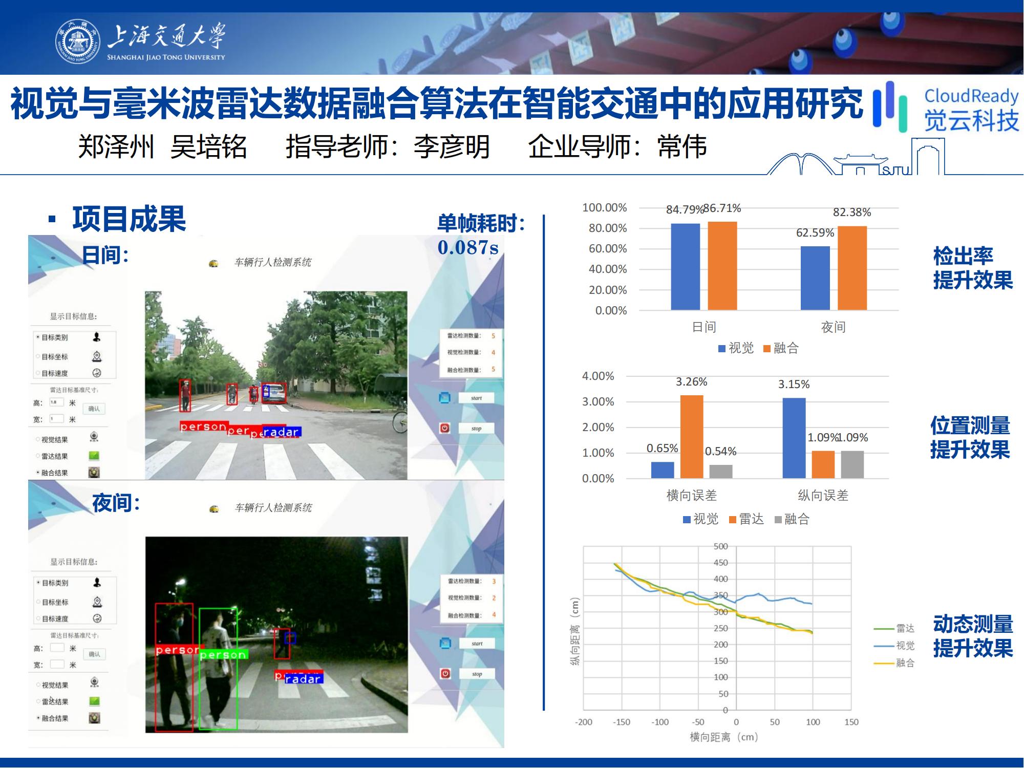提出了一种新的融合检测算法,使用一些创新性的方法手段避免现有算法问题,取得良好的效果,相比单一检测手段在检出率和测量精度上都有提升,尤其是夜间检出率提高约20%,并且适用检测目标和场景满足了企业要求。
