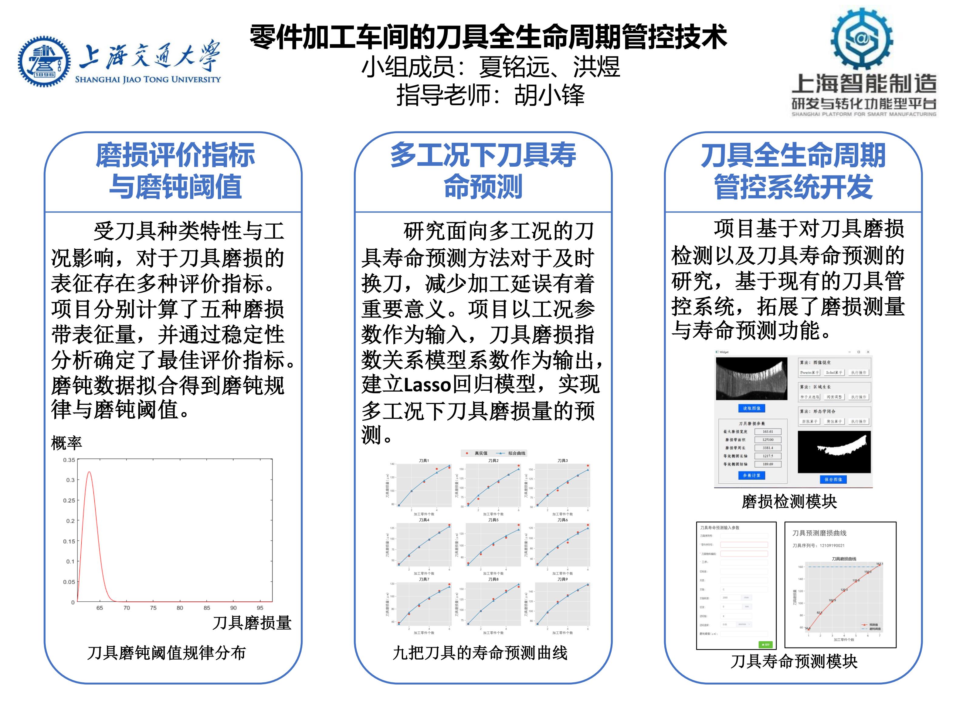 建立了零件加工车间刀具全生命周期管控系统的SysML模型。开发基于图像处理的刀具磨损带提取方法,对多个磨钝评价进行稳定性分析,得到Weibull分布为表征实验刀具的磨钝规律的最佳数据分布型,并最终确定实验刀具的磨钝阈值为155mm。提出一种基于Lasso模型的多工况下刀具寿命预测方法。辅助企业工程师完成零件加工车间刀具全生命周期管控系统开发,初步实现了小批量定制零件加工车间刀具全生命周期的精细化管控。
