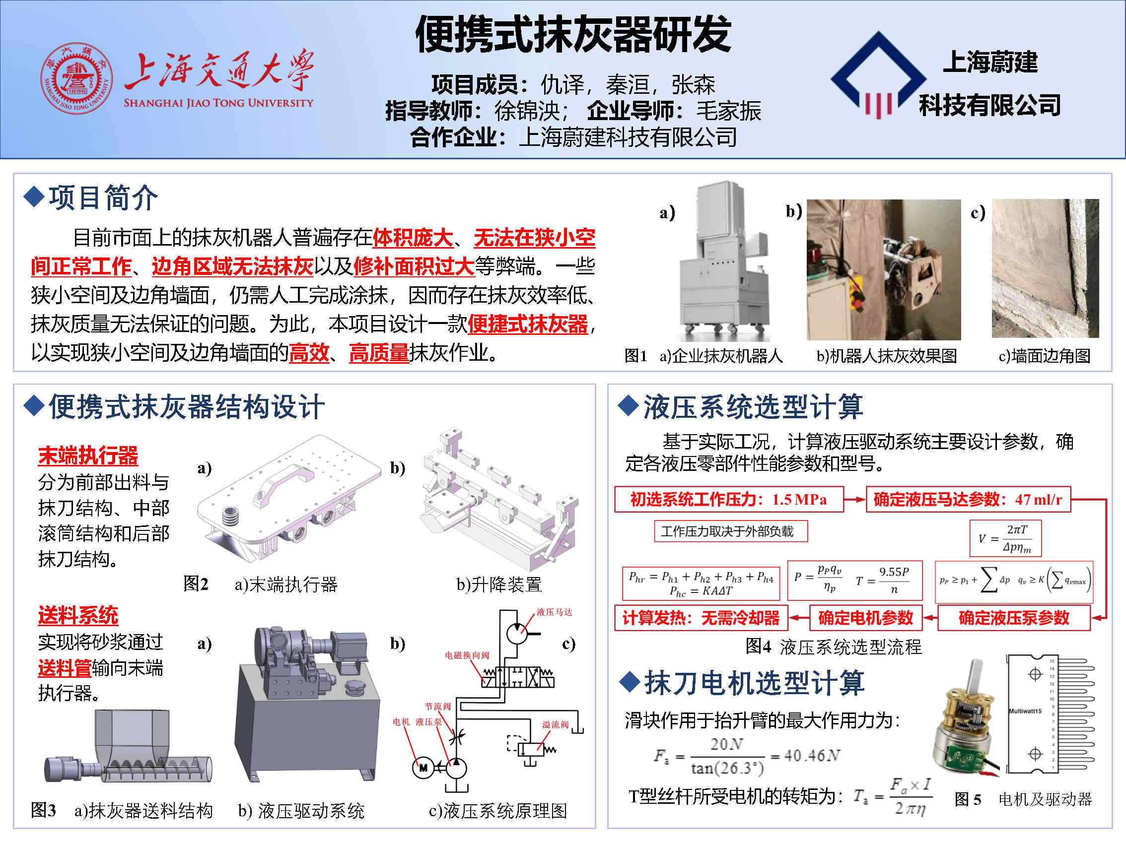 针对市面上智能抹灰机器人产品存在的问题,本项目旨在开发一款便携式的手持抹灰器,可以由工人便携手持,将灰浆均匀涂抹在墙面上,并进行刮平压实以及抹灰厚度调整。相对于智能抹灰机器人,便携式抹灰器末端体积较小,可以自由进出小空间,并对门框、房梁以及墙面边角进行涂抹。该抹灰器不需要人工返工,一次抹灰过程即可同时完成抹平灰浆和压实墙面的任务,抹灰效率预期是人工的3-5倍,抹灰器末端的机械结构设计可以保证墙面平整度。