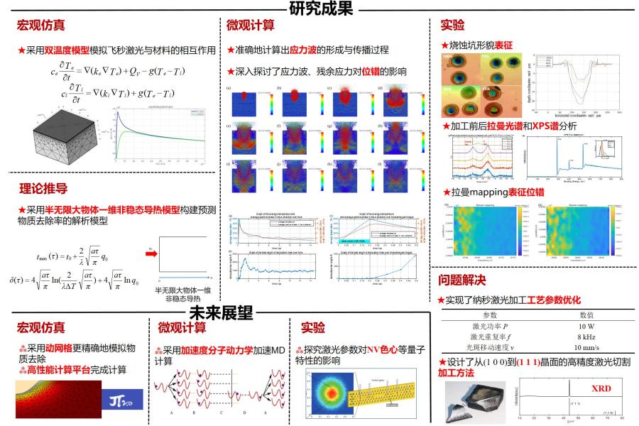 单晶金刚石性能优异,却是典型的难加工材料,严重制约了相关基础及应用研究进展。近年来,脉冲激光加工已逐渐推广用于单晶金刚石的切割、抛光及微纳结构加工,但在加工过程中易出现石墨化、位错生成等问题,进而影响量子等功能特性,相关影响机理尚不明确,加工工艺有待优化。针对上述问题,本研究构建了脉冲激光加工金刚石的宏观、微观过程仿真模型,得出了激光加工过程中关键物理场的变化规律以及应力波传播、位错扩展的规律;将激光加工与材料性能表征实验相结合,系统研究了脉冲激光加工参数对单晶金刚石核心性能评价指标的影响规律,据此完成了加工工艺参数的优化。