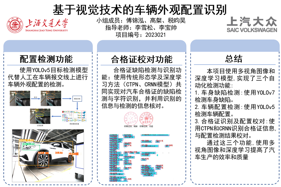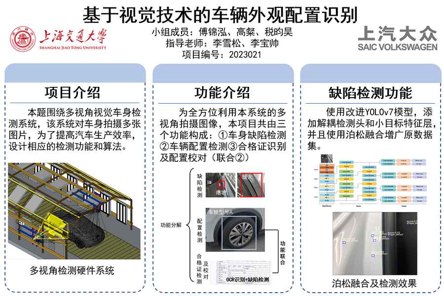 本项目主要探究车身缺陷检测、配置检测的相关技术,其中配置内容需要结合车辆合格证信息。对车身缺陷检测模块,需要快速、准确得到车身照片中可能存在的缺陷位置和类型,并经过视觉算法得到缺陷的大小、尺寸等信息;对配置检测模块,需要通过目标检测模型完成对车辆个性化外观配置零件的自动识别;对汽车合格证图片,需要进行缺陷检测、字符识别,得到相关信息与检测得配置进行校对,检查记录与实际的一致性。最后进行各功能的联合。