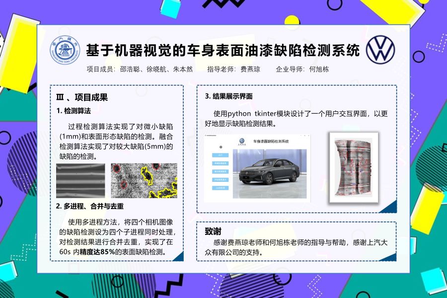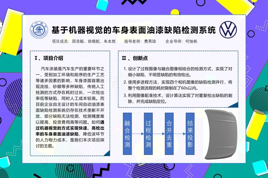 对采集图像使用传统检测算法检测漆面缺陷,采用图像拼接技术实现多幅相机图像拼接并标出缺陷位置。预期最终在60s内实现车身漆面缺陷检测且精度不低于85%-90%,同时在车身模型图中准确定位、显示缺陷。